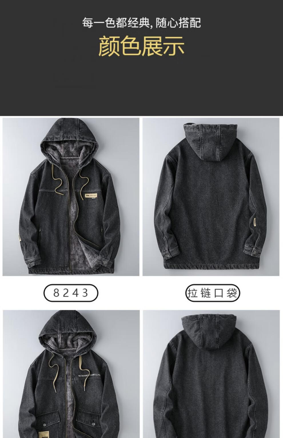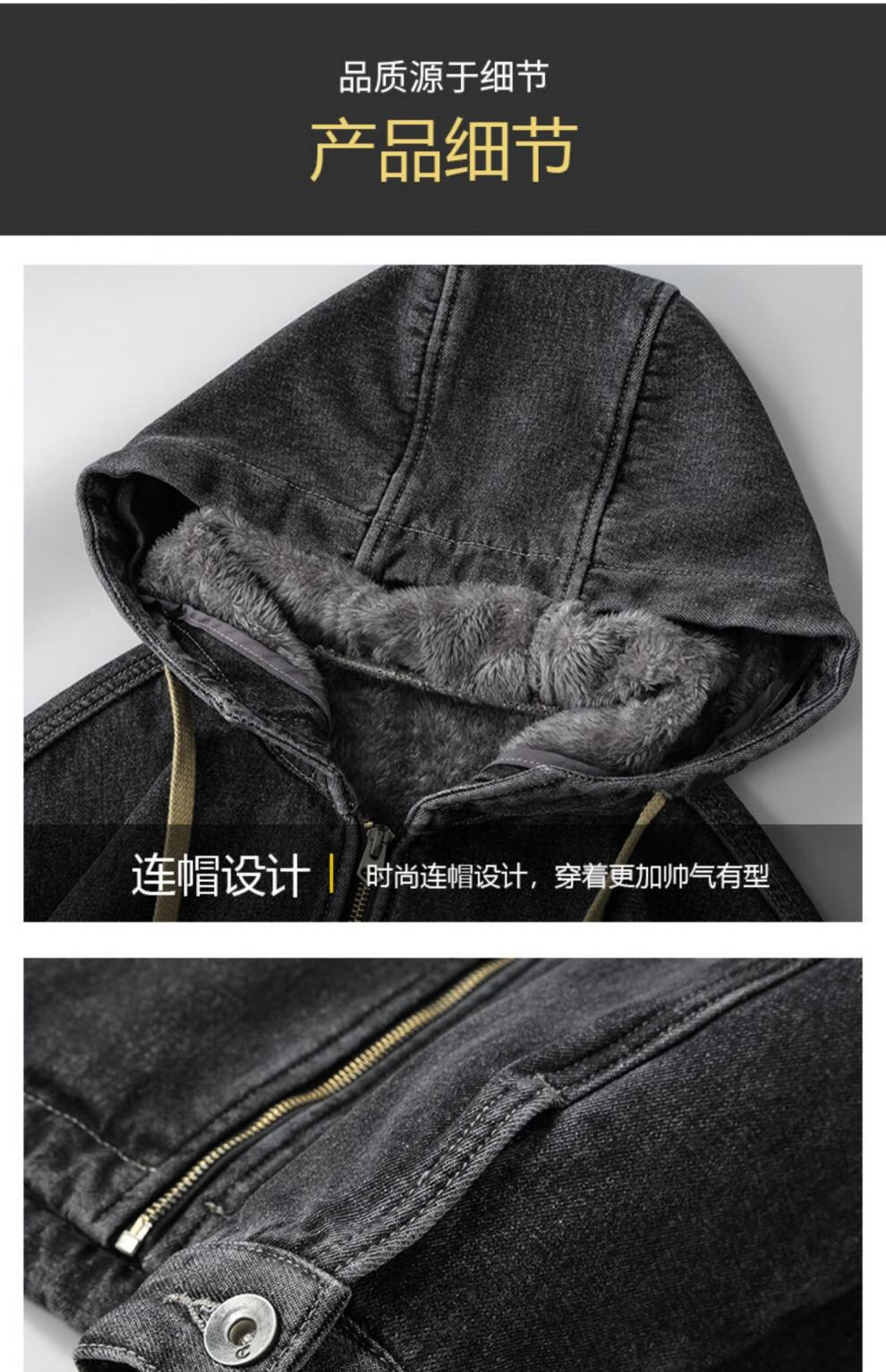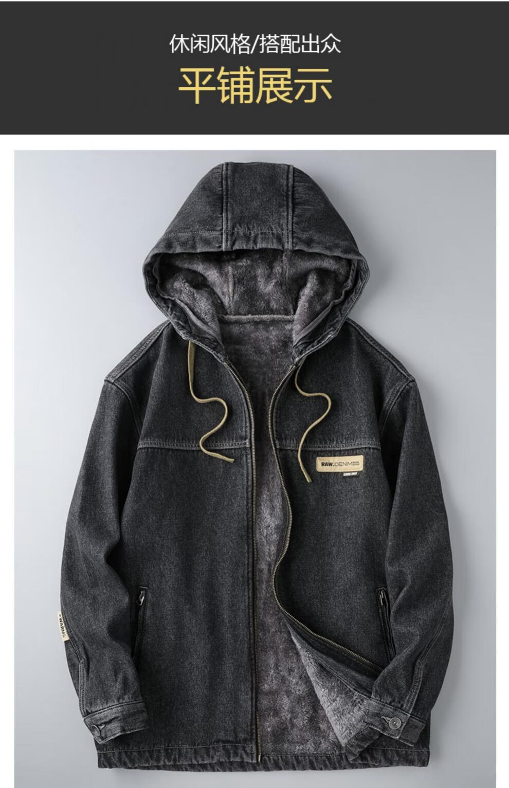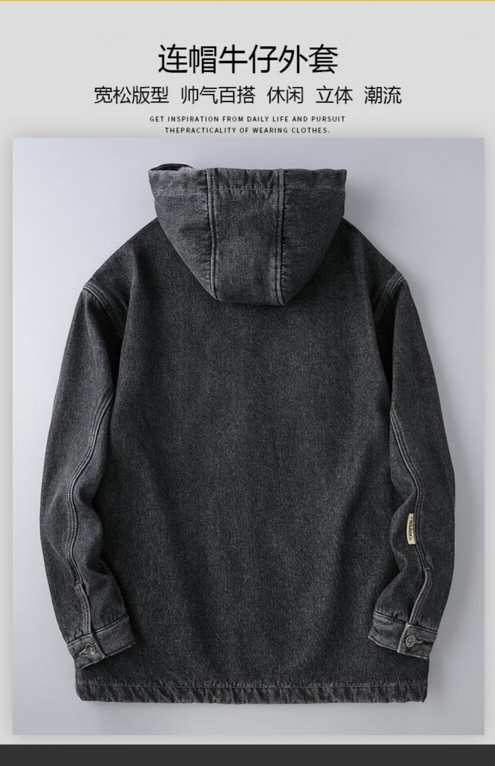 JEEP SPIRIT轻奢连帽加绒牛仔外套男秋冬宽松大码中长款加厚拉链休闲棉衣夹克 深灰色 X8243牛仔外套 加绒 2XL 170-185斤
