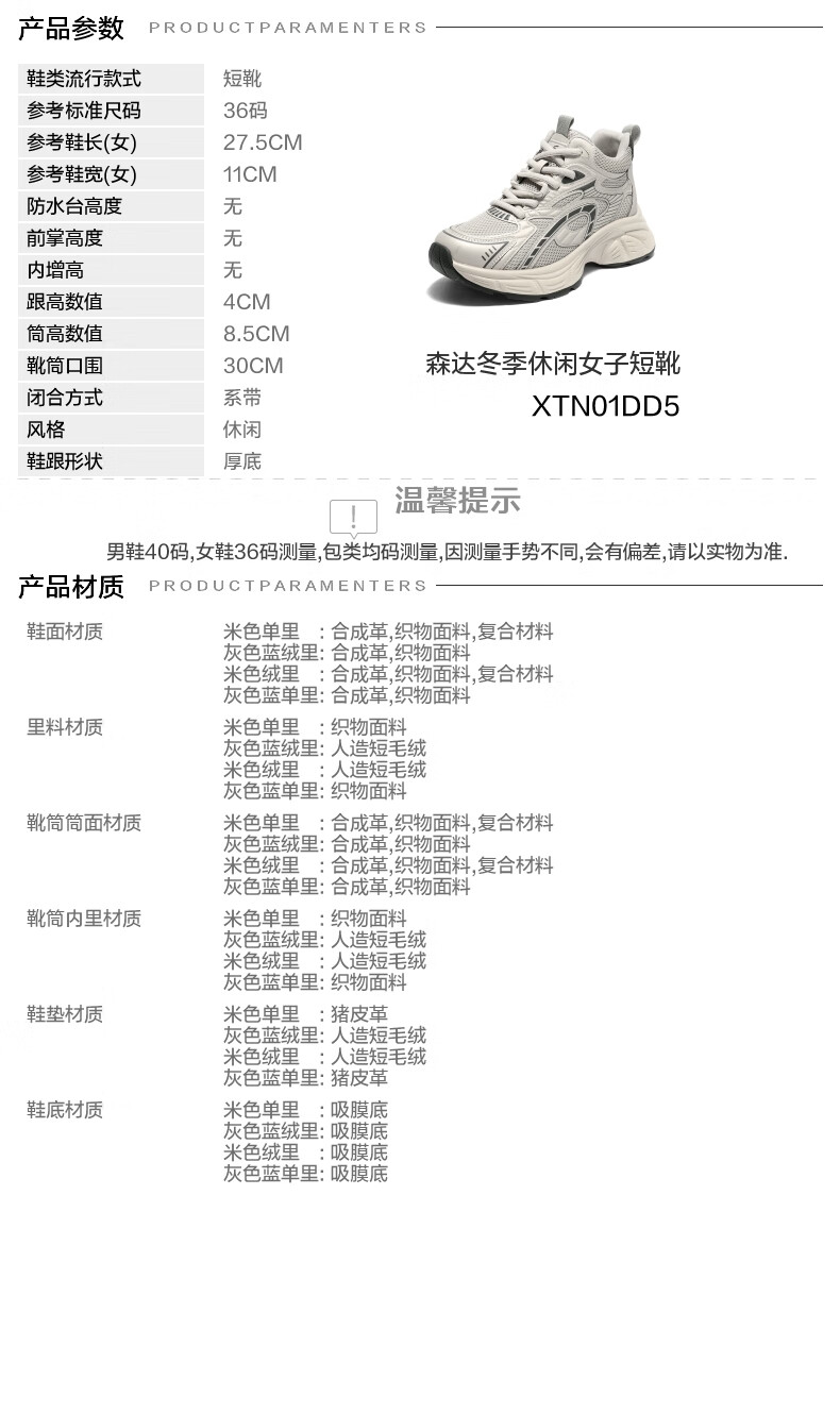 森达高帮鞋女2025冬新商场同款运动厚底休闲老爹鞋XTN01DD5 灰色蓝绒里 38