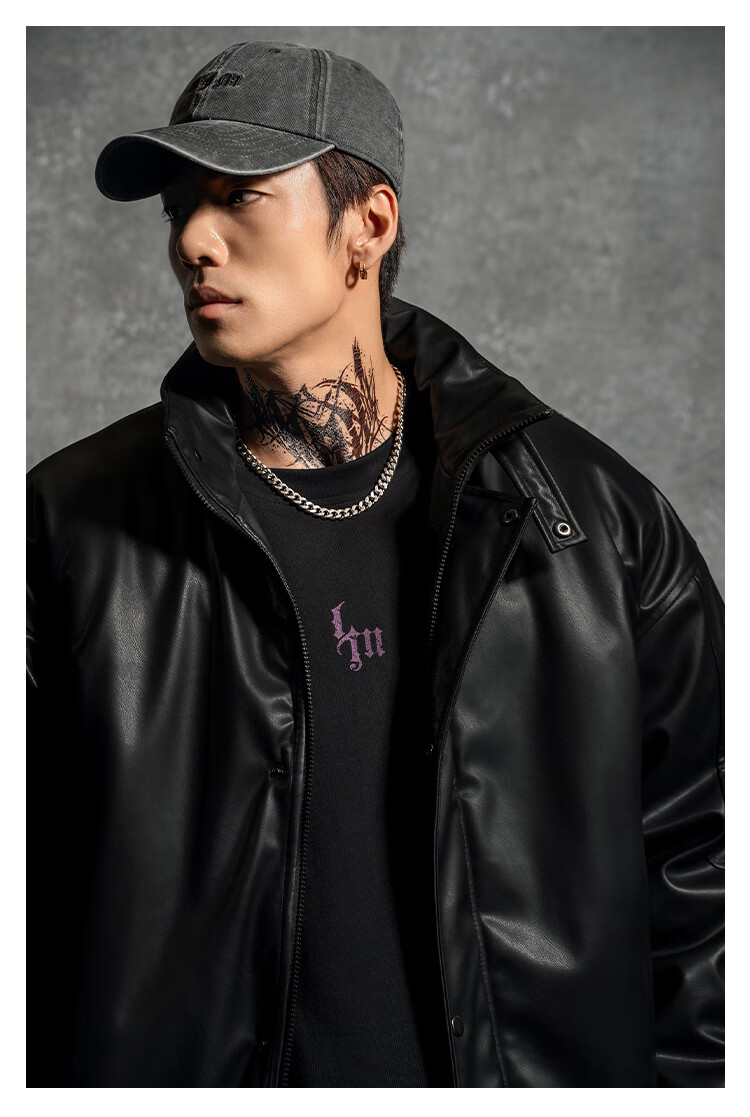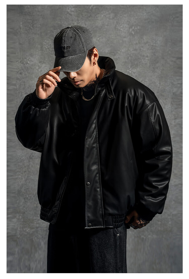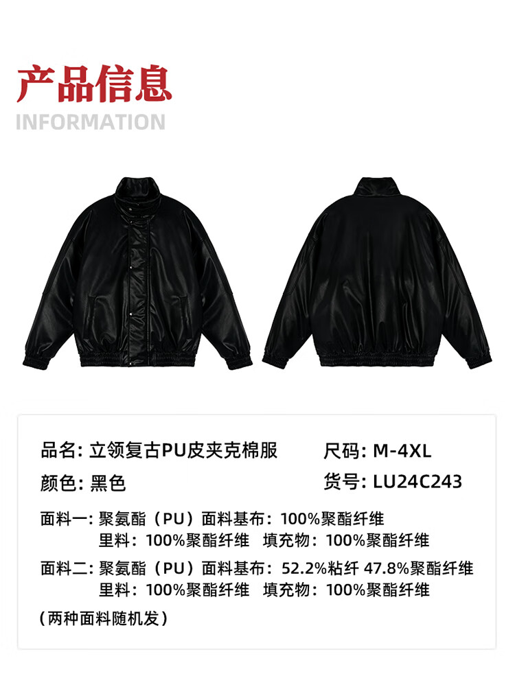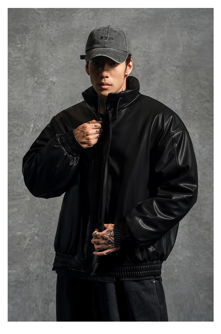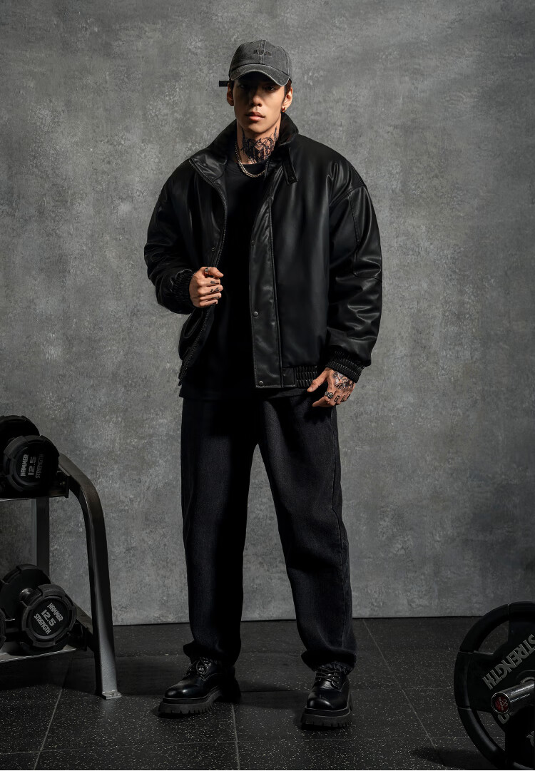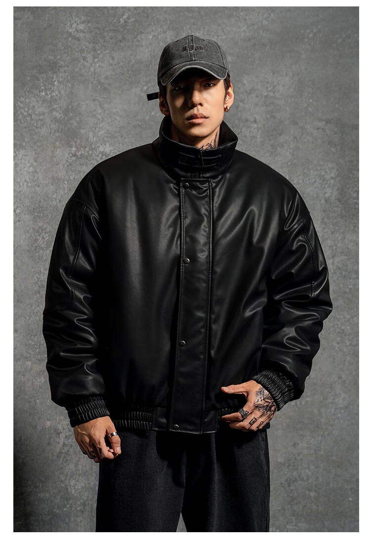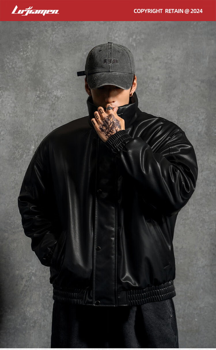 鹿家门新款宽松大码保暖皮夹克棉衣百搭运动健身PU皮棉服秋冬男 黑色(棉服) (尺码偏小建议拍大一码) 2XL (推荐180-220斤)