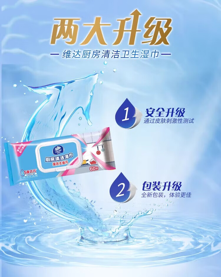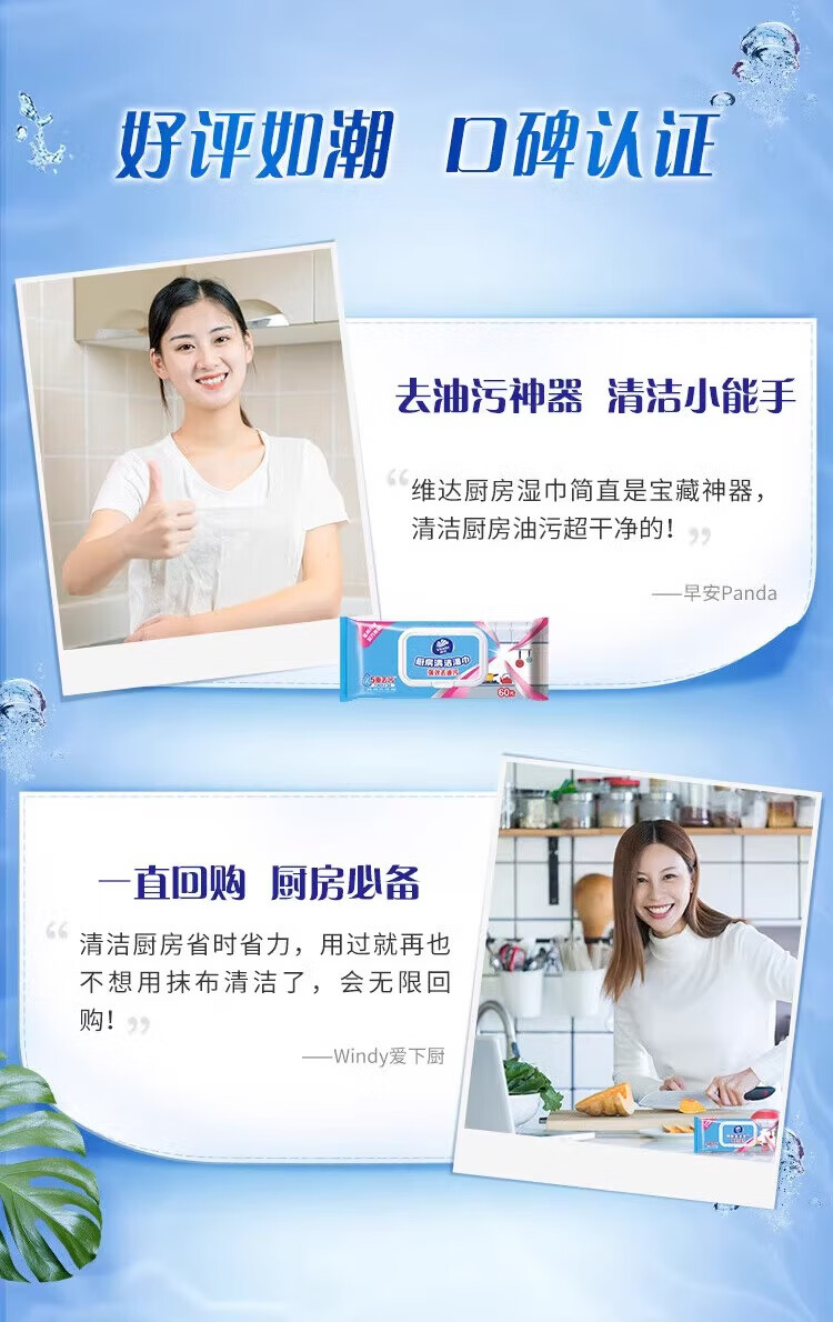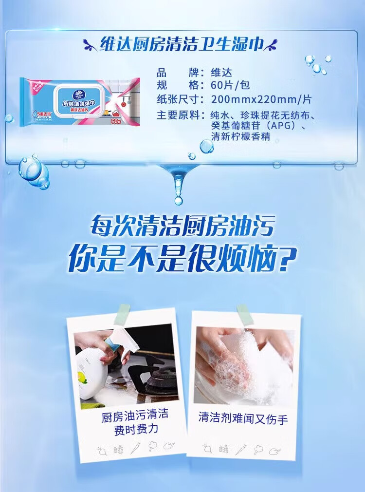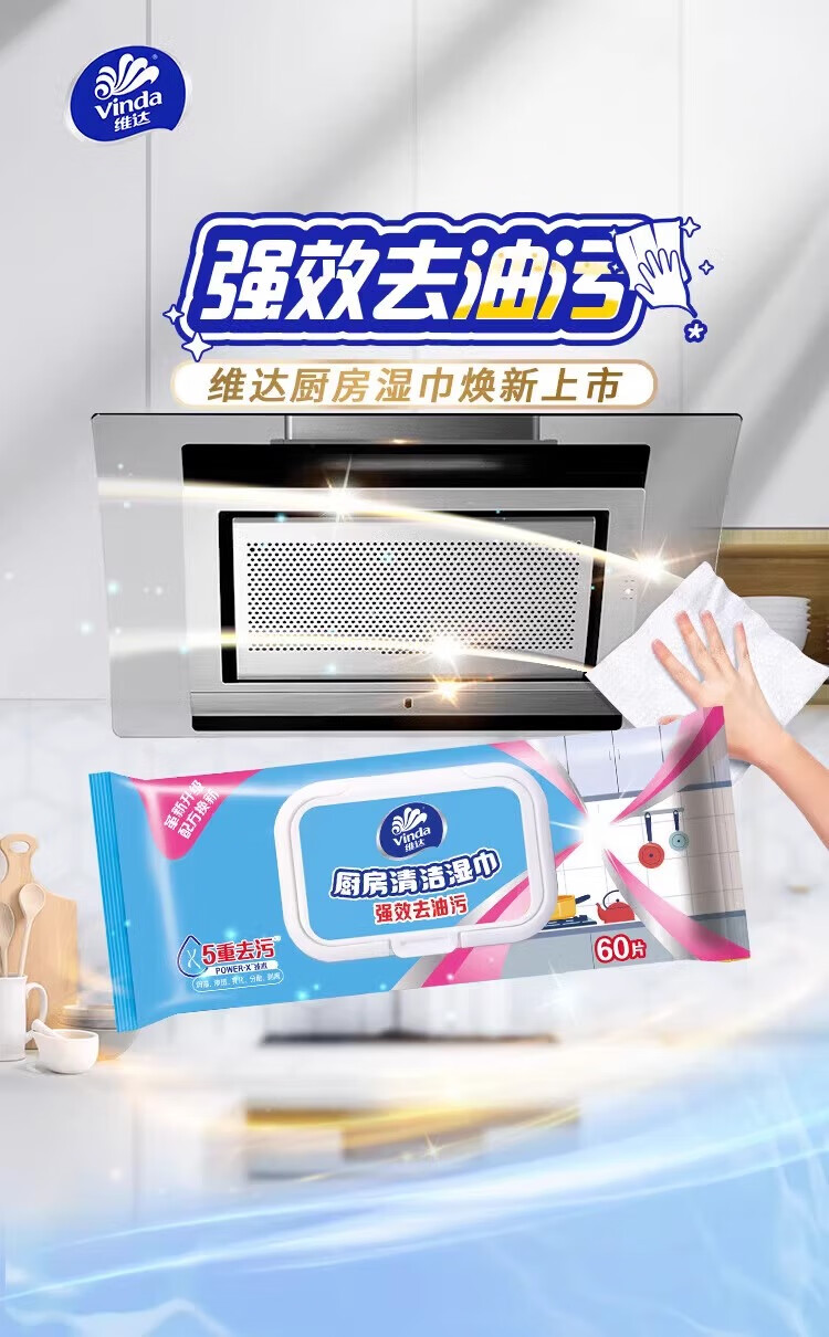 维达(Vinda)厨房湿巾 珍珠提花无纺布吸油纸 强力去油污家用懒人抹布清洁纸巾 【加大L码200*220mm】 1层 60片*1包