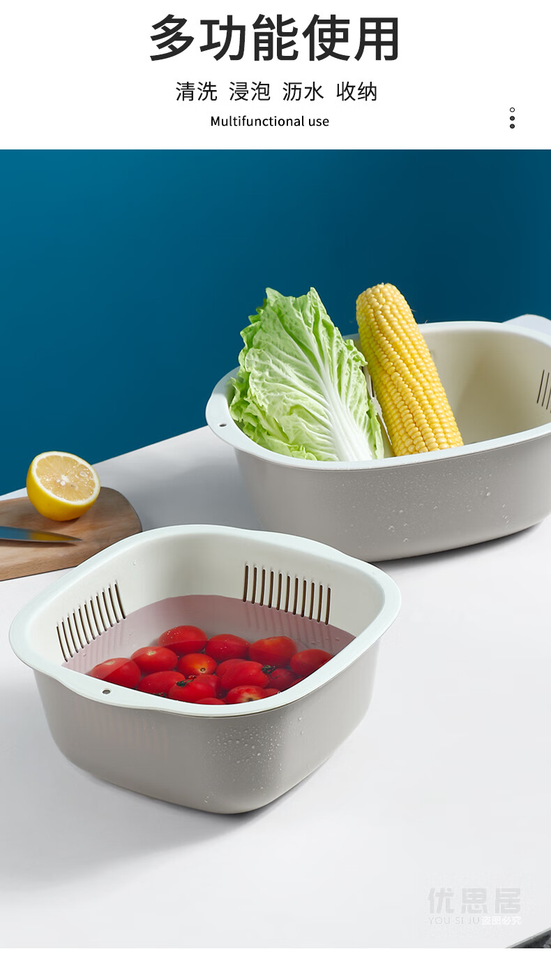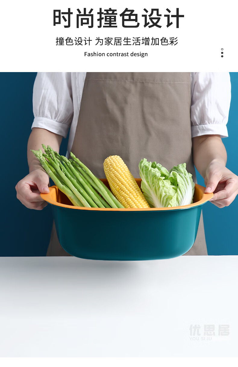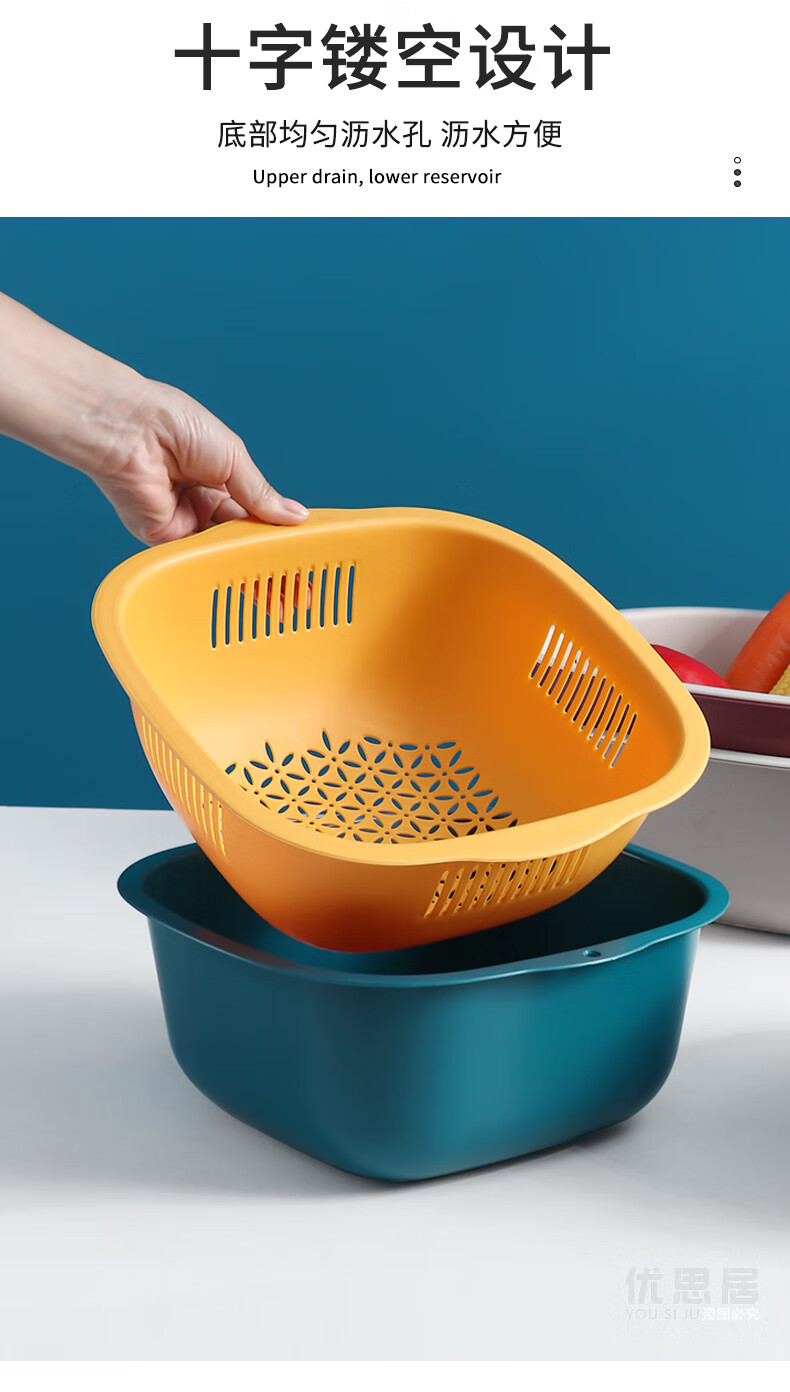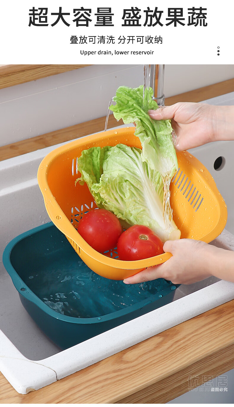 洗水果盆 洗菜篮 沥水篮双层洗菜盆塑料厨房汲水漏盆客厅家用水果 正方形深蓝色 0ml