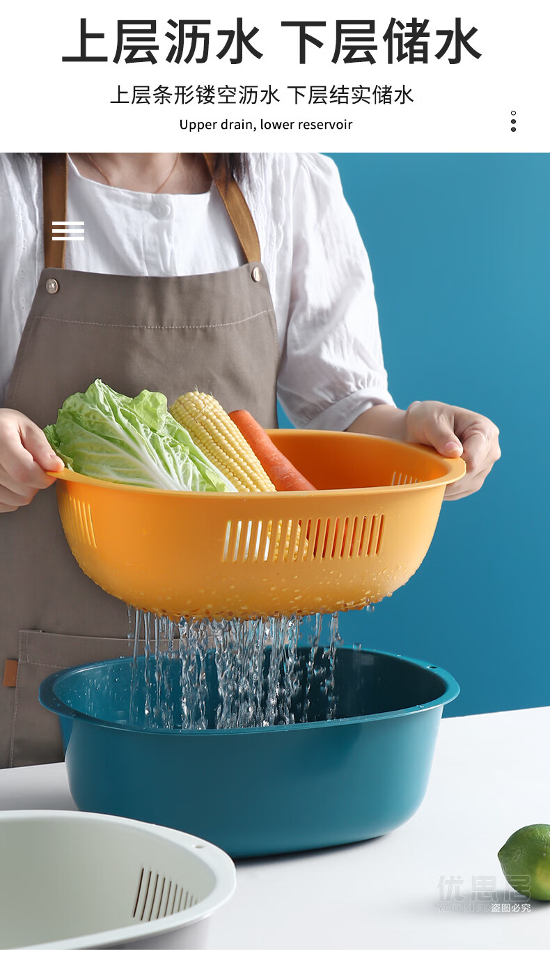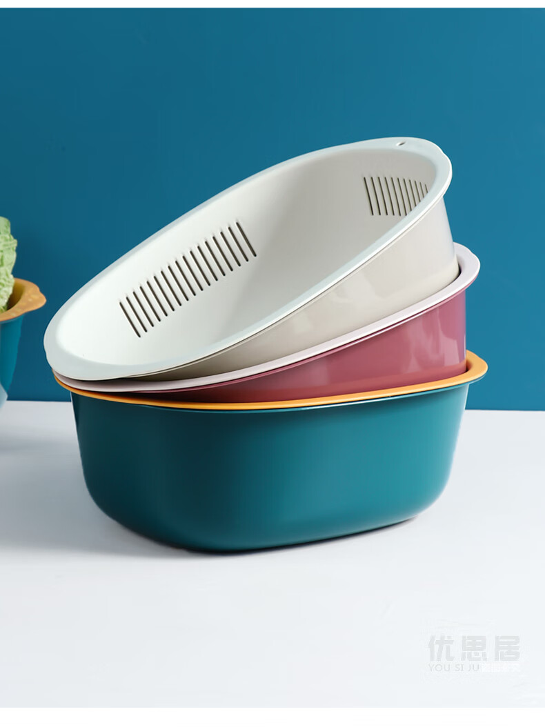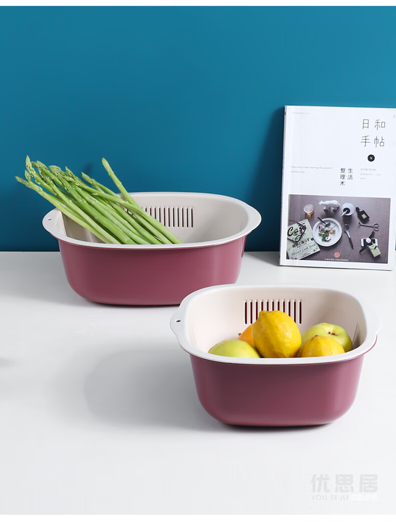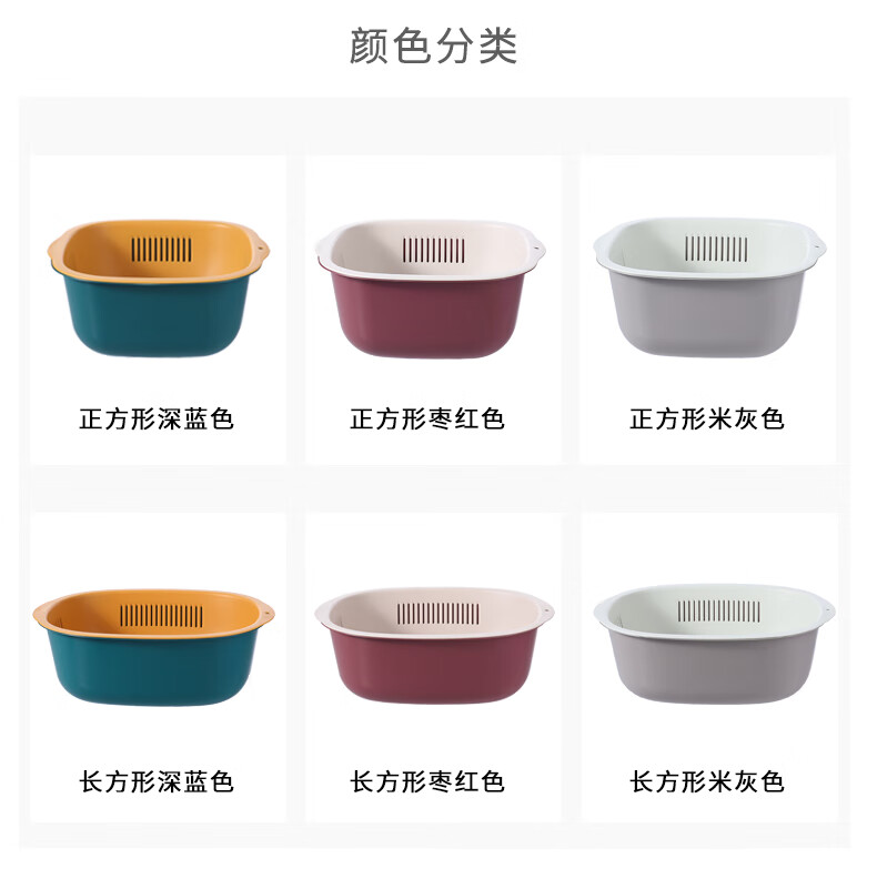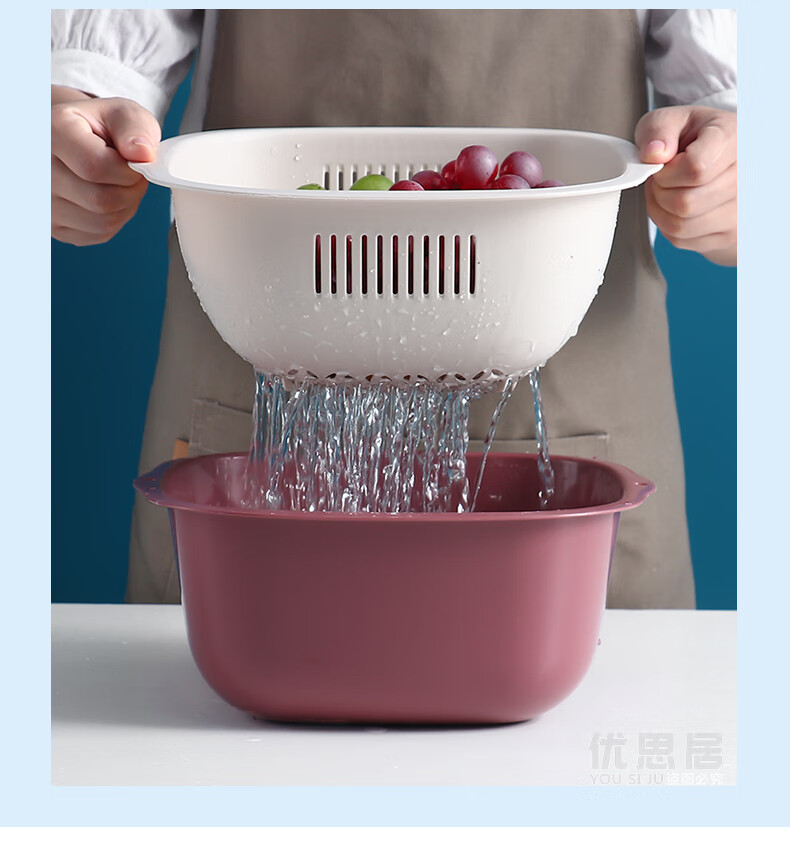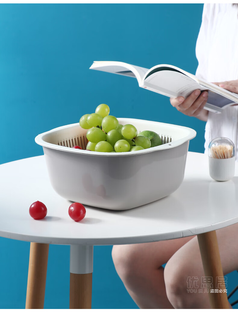 洗水果盆 洗菜篮 沥水篮双层洗菜盆塑料厨房汲水漏盆客厅家用水果 正方形深蓝色 0ml