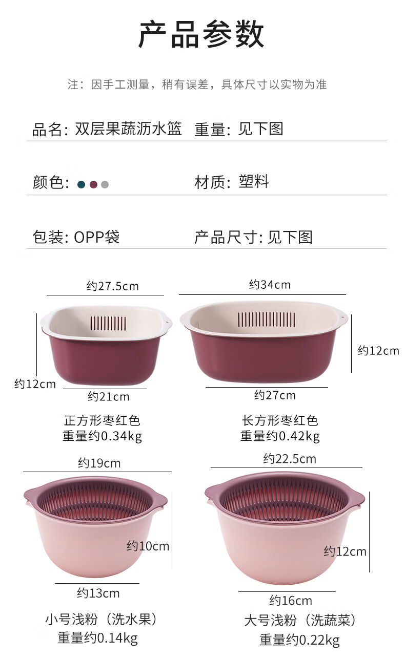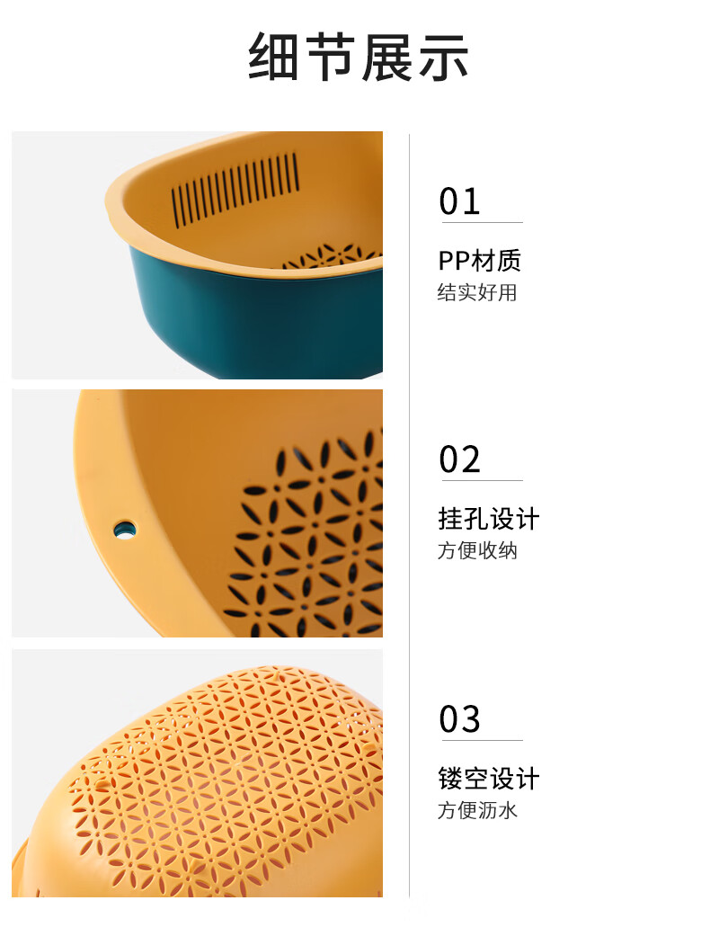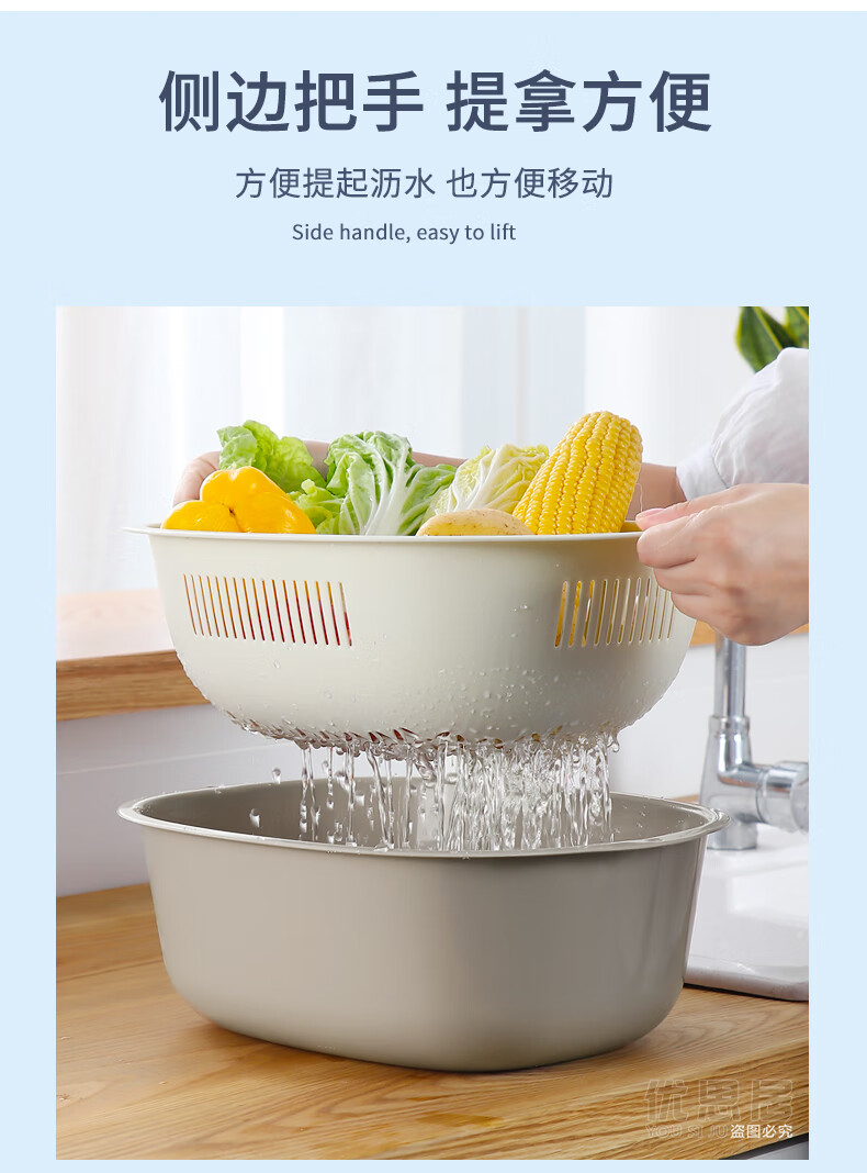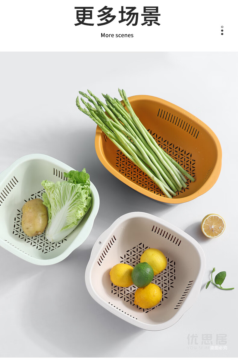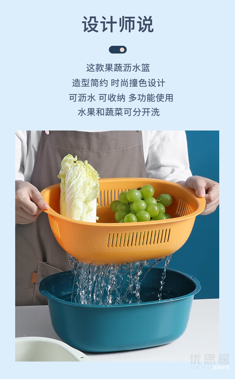 洗水果盆 洗菜篮 沥水篮双层洗菜盆塑料厨房汲水漏盆客厅家用水果 正方形深蓝色 0ml