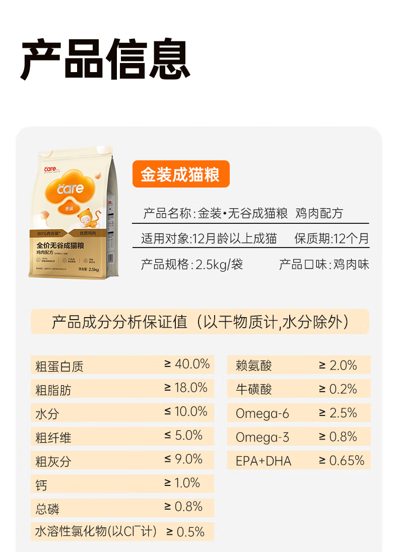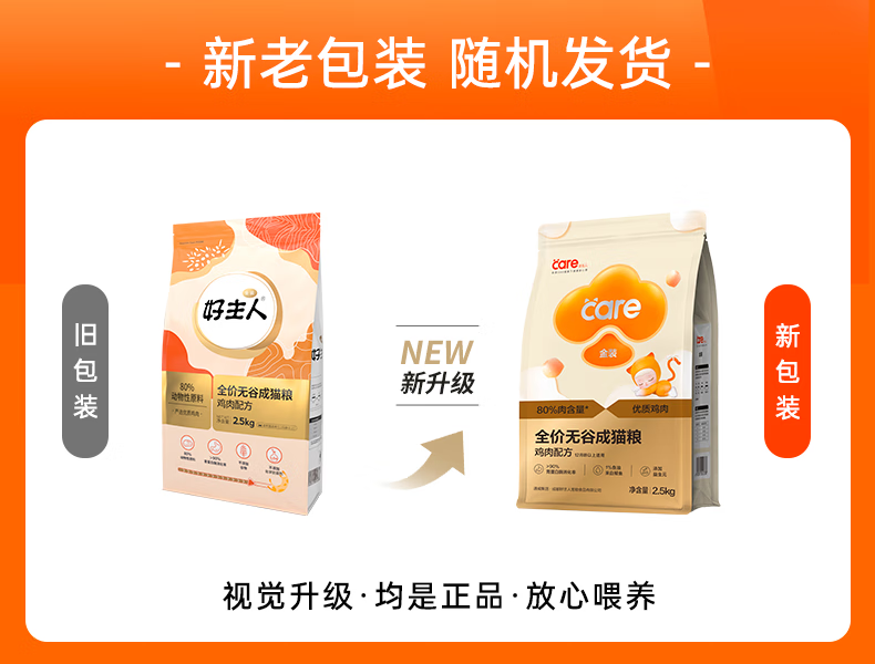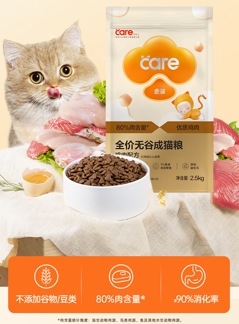 好主人(CARE)金装无谷猫粮通用高肉高蛋白【升级金装80%含肉量】成猫粮2.5kg