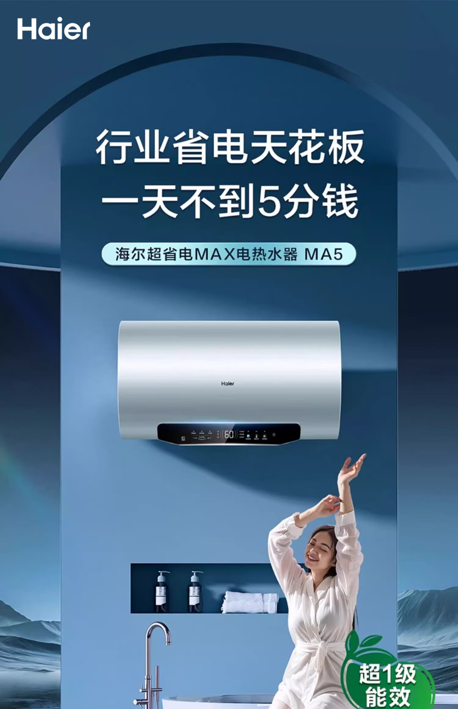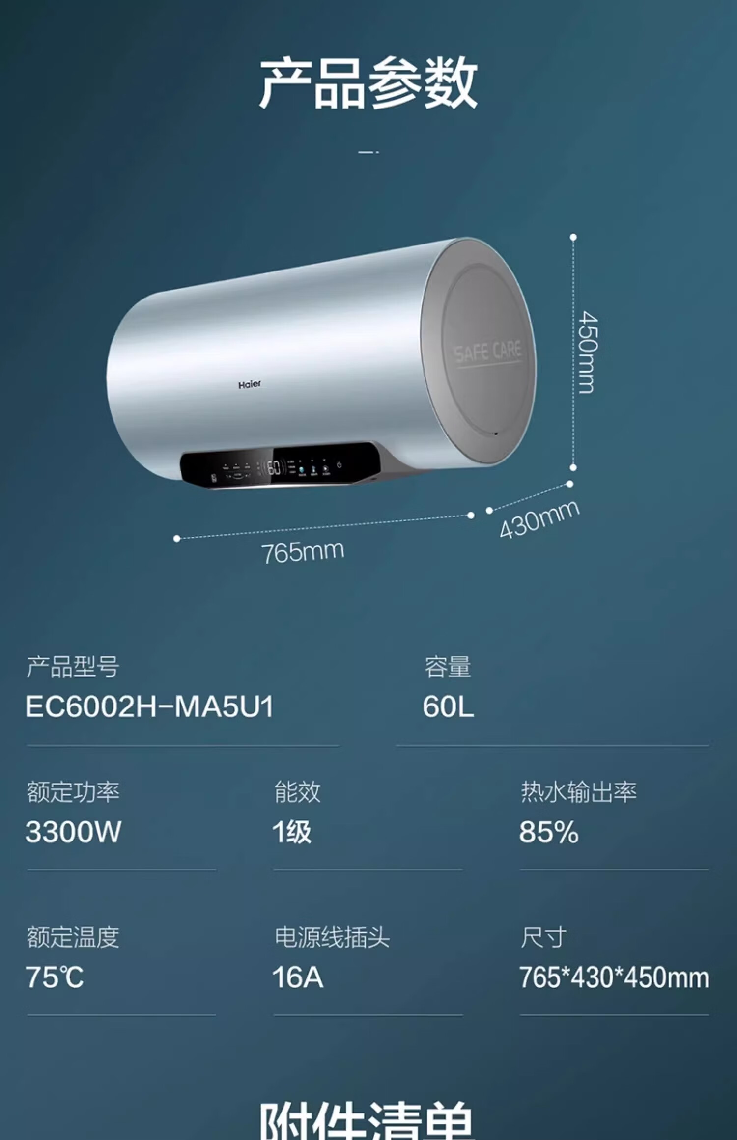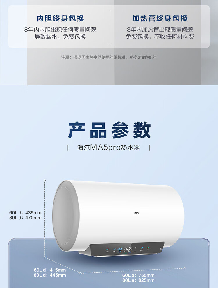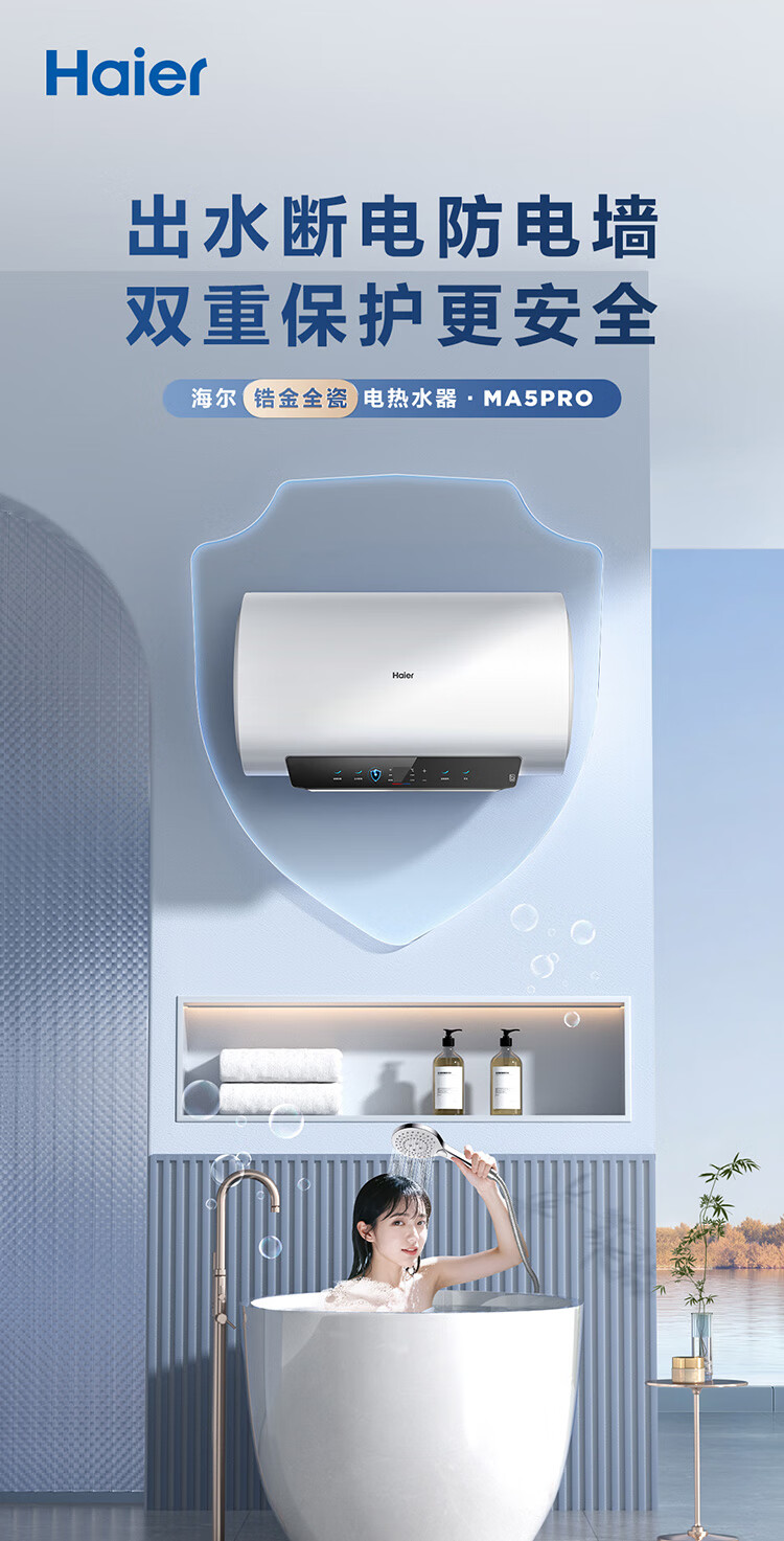 海尔(Haier)【咨询立省20%】电热水器60升热水器镁棒免更换超省电MA5/MA5PRO家用储水式超一级能效智能变频 60L 3300W 【出水断电+防电墙】MA5PRO