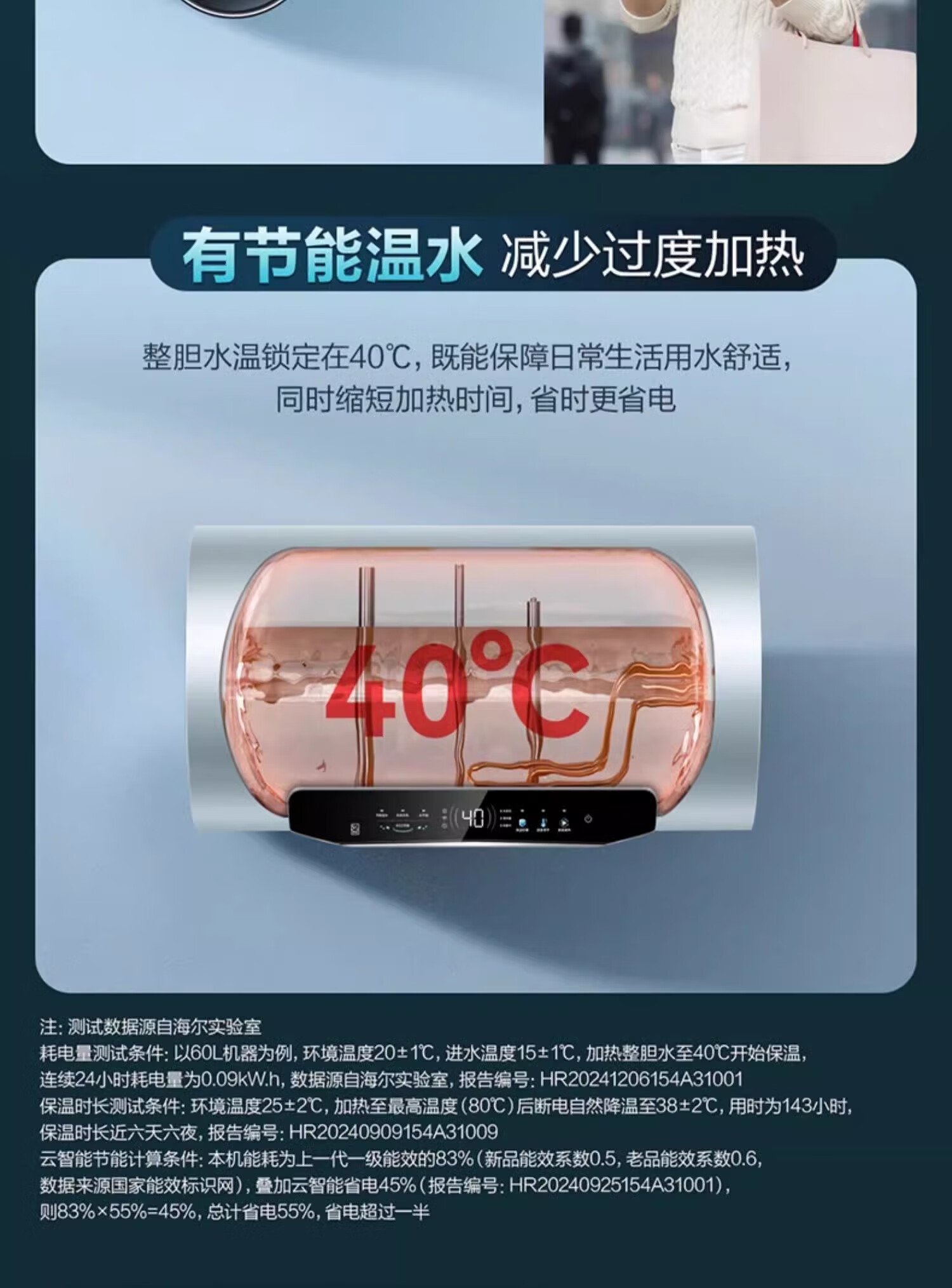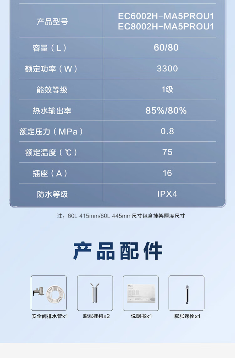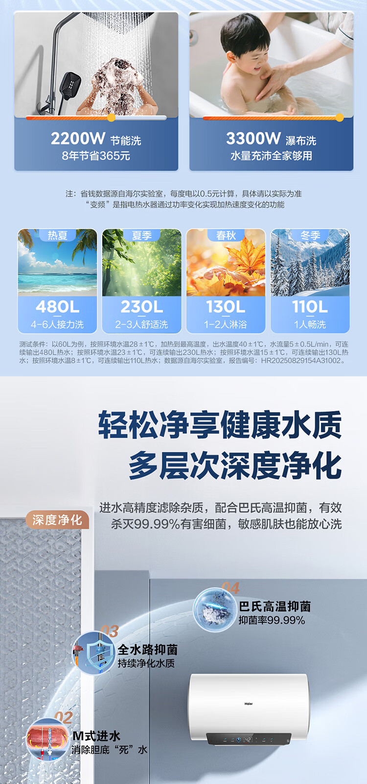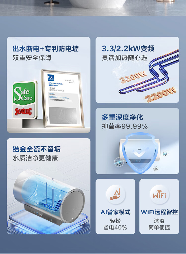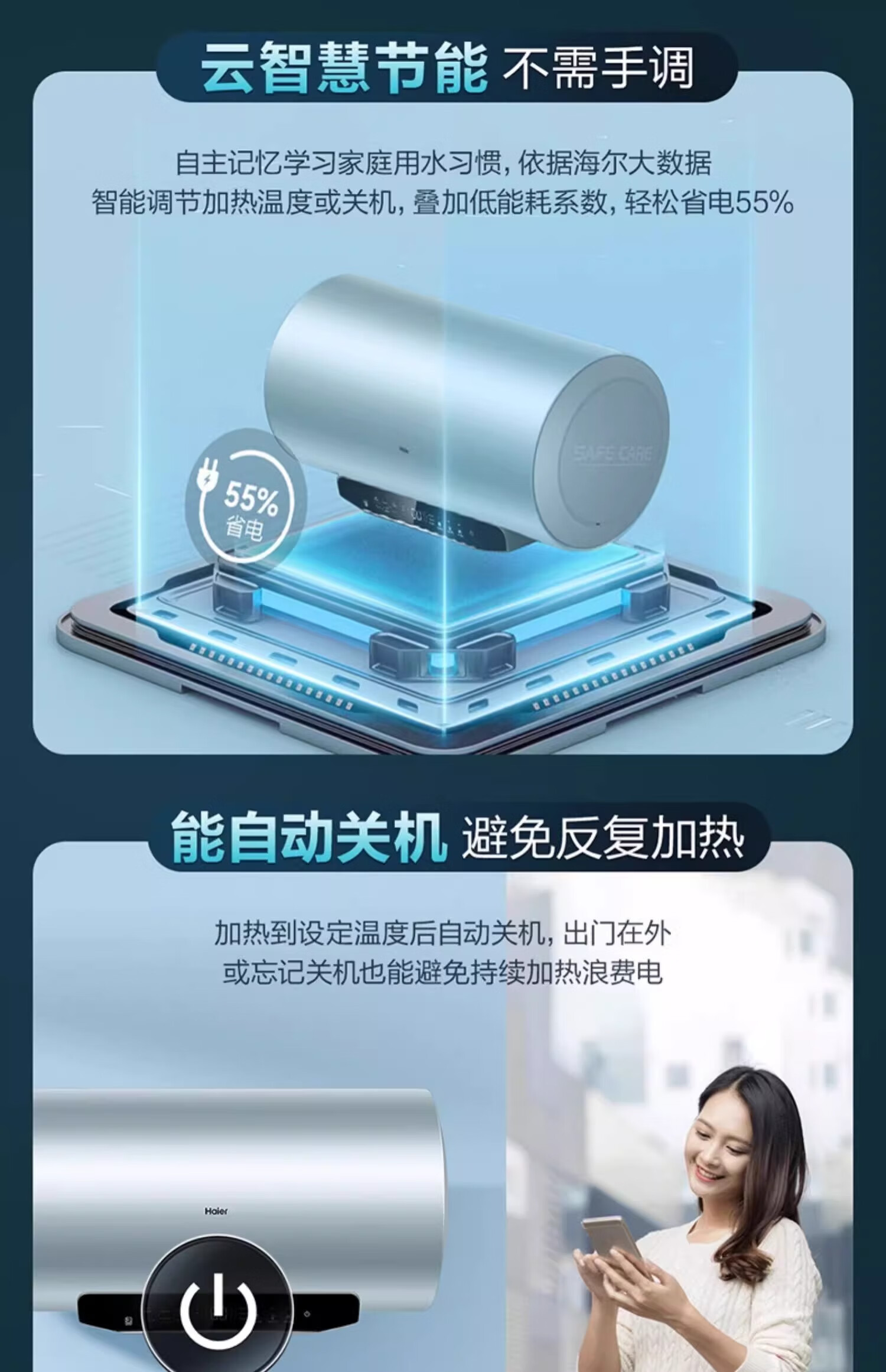 海尔(Haier)【咨询立省20%】电热水器60升热水器镁棒免更换超省电MA5/MA5PRO家用储水式超一级能效智能变频 60L 3300W 【出水断电+防电墙】MA5PRO