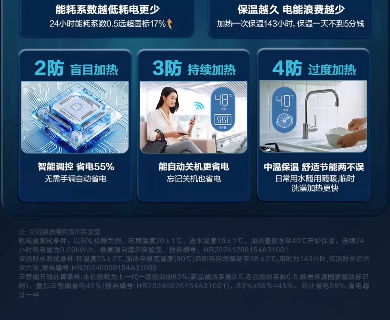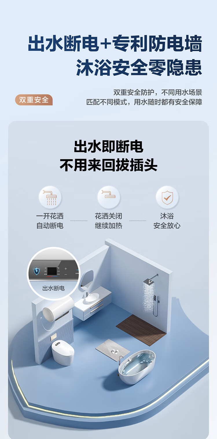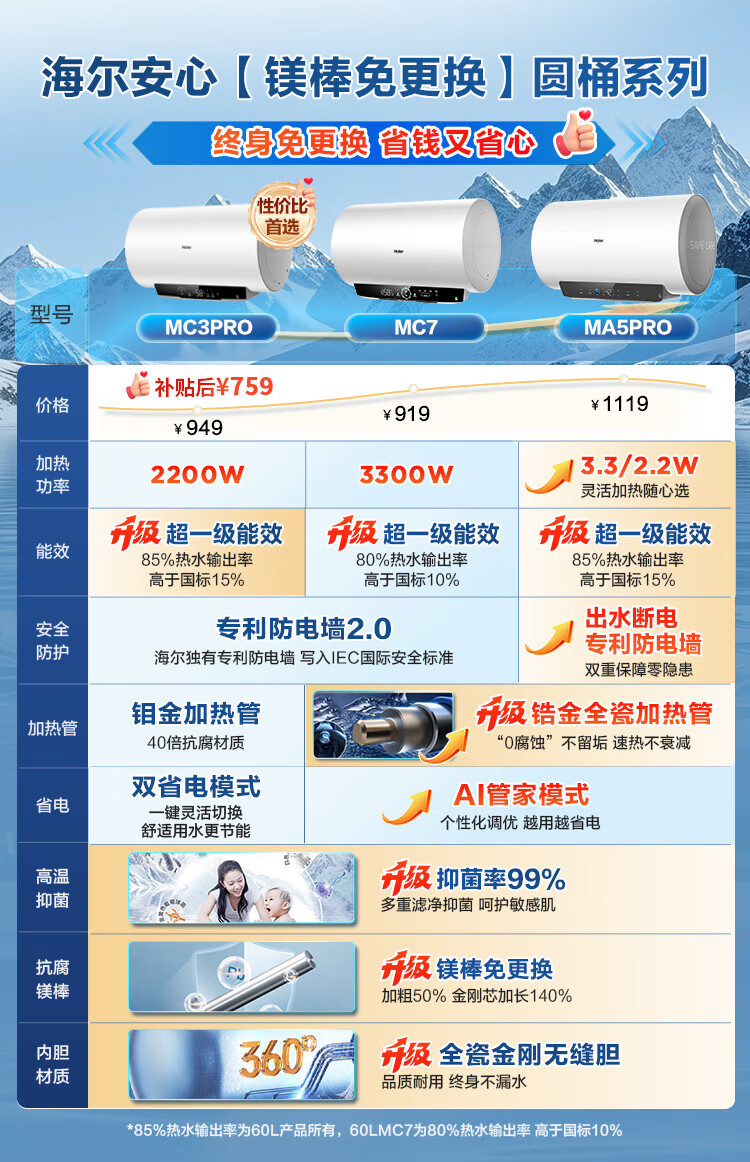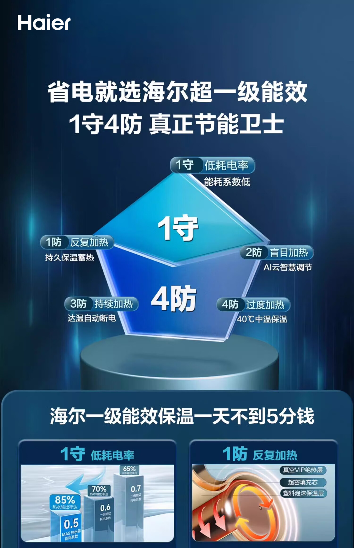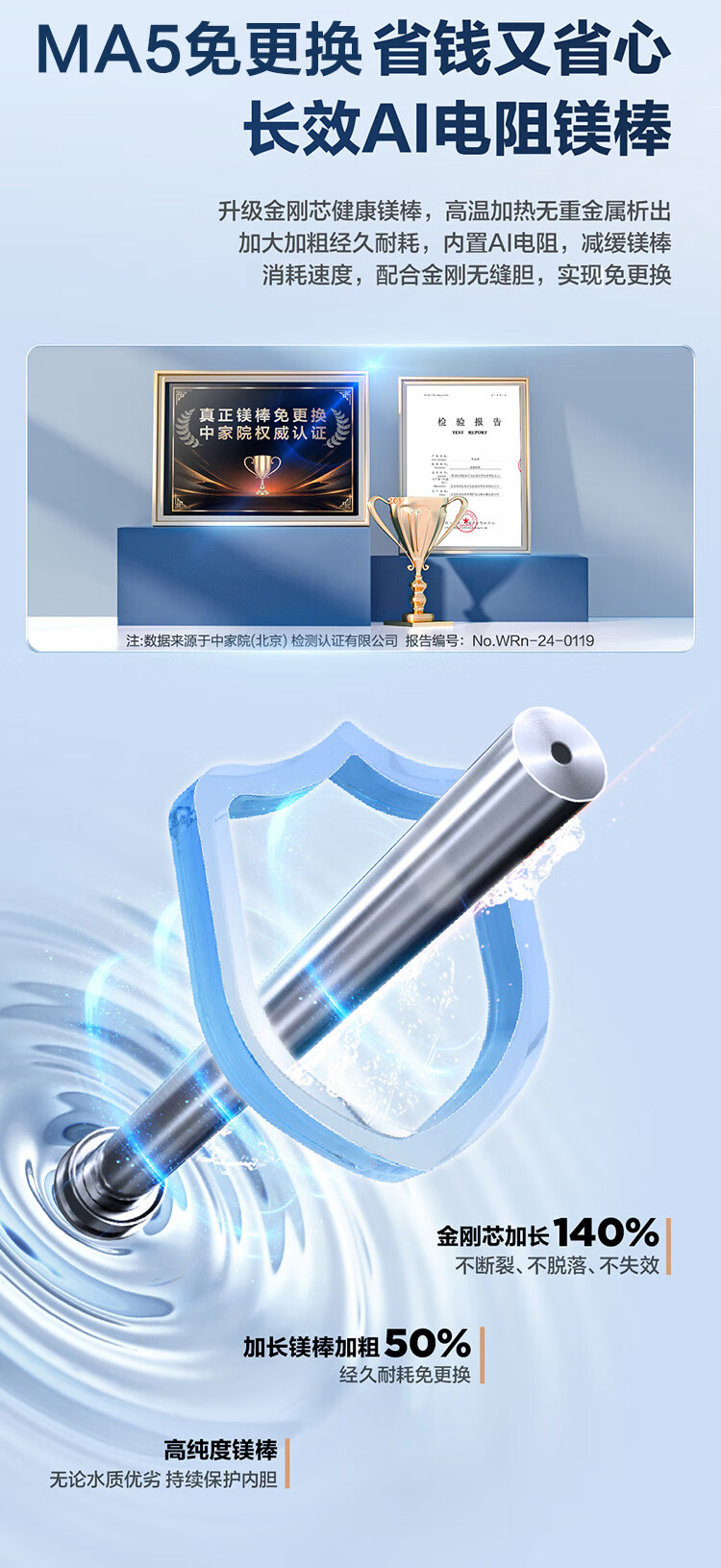 海尔(Haier)【咨询立省20%】电热水器60升热水器镁棒免更换超省电MA5/MA5PRO家用储水式超一级能效智能变频 60L 3300W 【出水断电+防电墙】MA5PRO