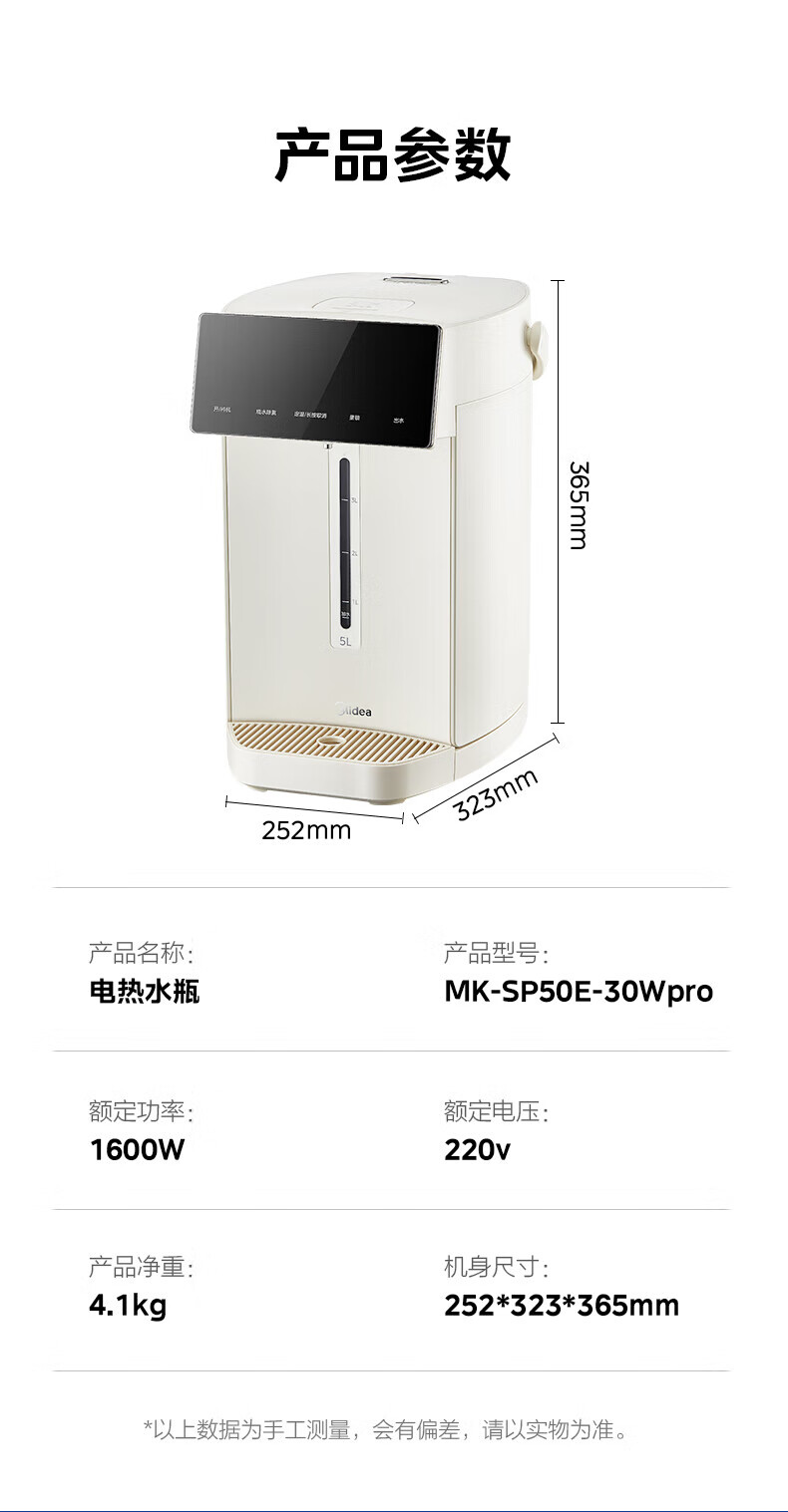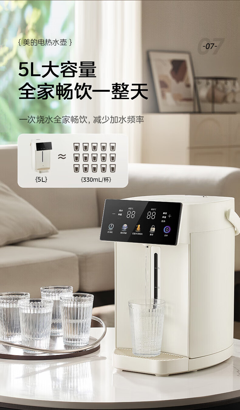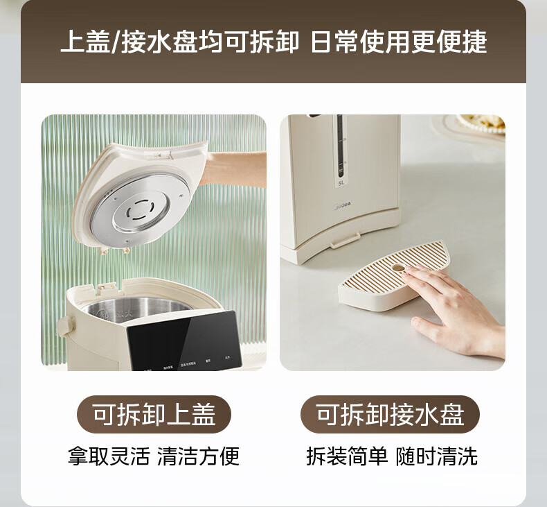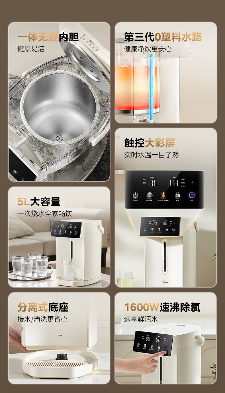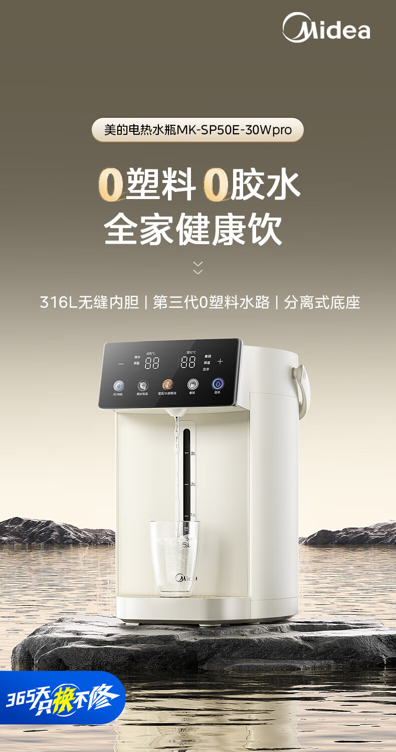 美的(Midea)电热水瓶 5L大容量家用电热水壶 健康0塑料水路饮水机 多段控温烧水壶 速沸除氯 可拆分离式底座 5L 【0塑料水路】SP50E-30Wpro