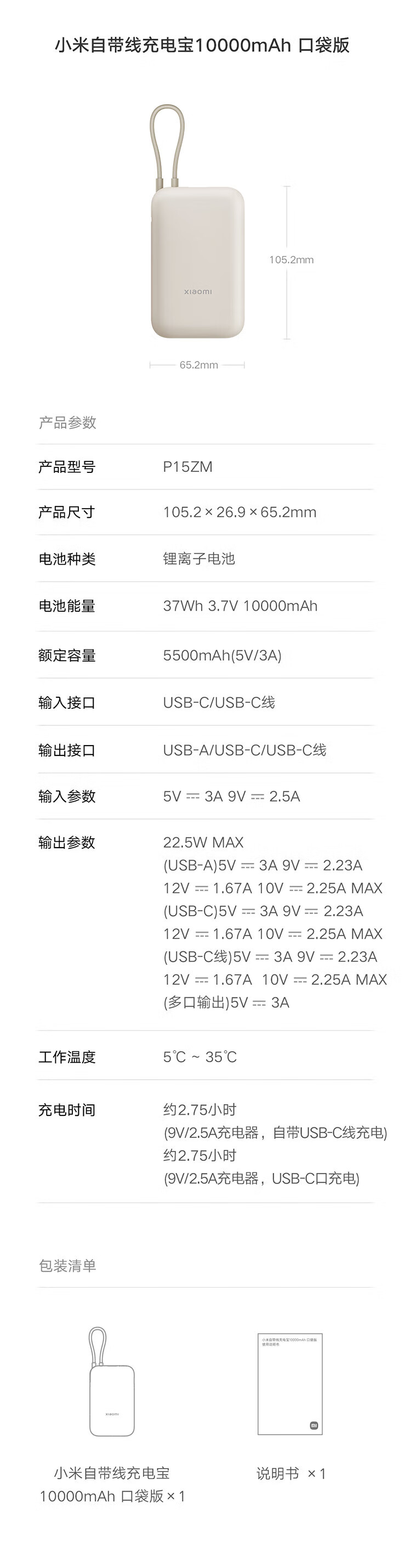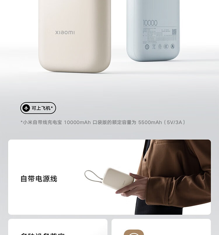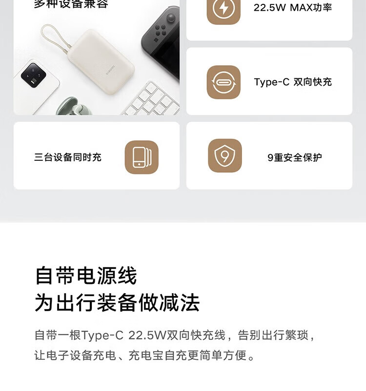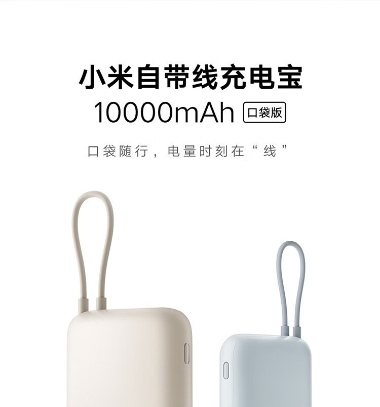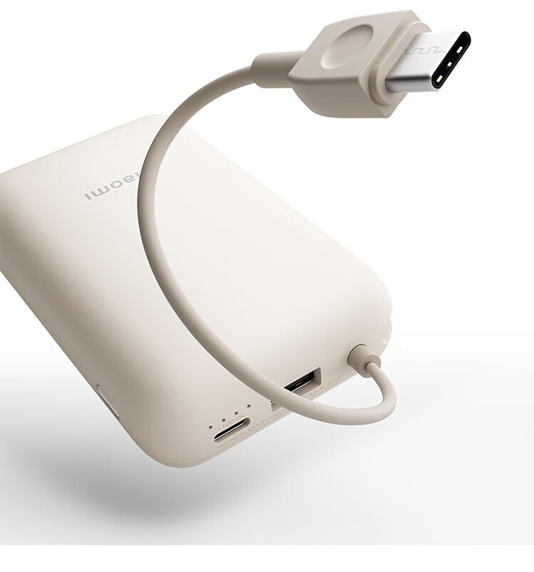 小米(MI)【3C认证】自带线充电宝10000mAh口袋版移动电源可上飞机Type-C双向快充 22.5W大功率适用小米苹果 浅咖色