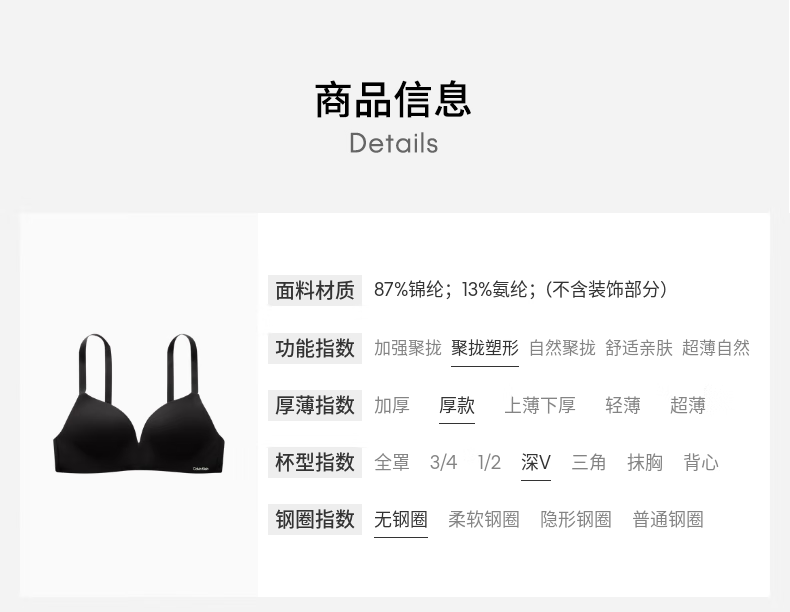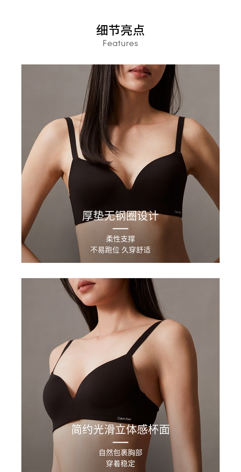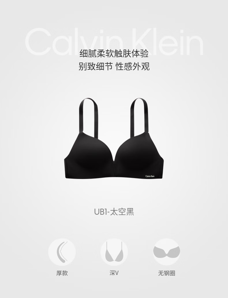Calvin Klein内衣女士舒适无钢圈软支撑ck无痕大胸显小性感聚拢厚垫深V文胸 UB1-太空黑 75B 34B