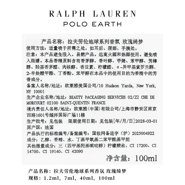 RALPH LAUREN 拉夫劳伦地球玫瑰绮梦100ml香水玫瑰花香调女士香新年礼物送女友