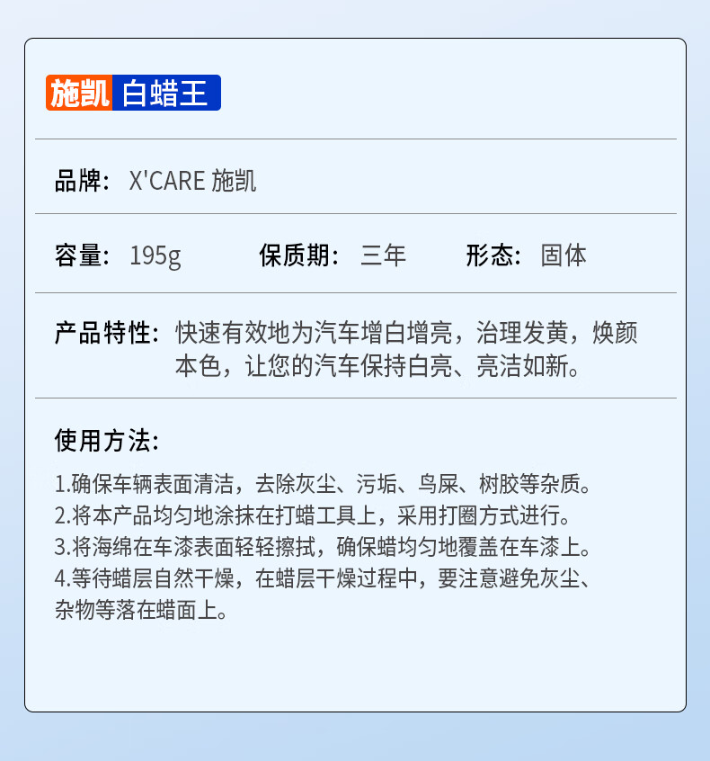 施凯汽车蜡养护蜡白色车专用防污防发黄上光保养镜面持久祛渍专用神器 白蜡王【长效防护 亮白如新】