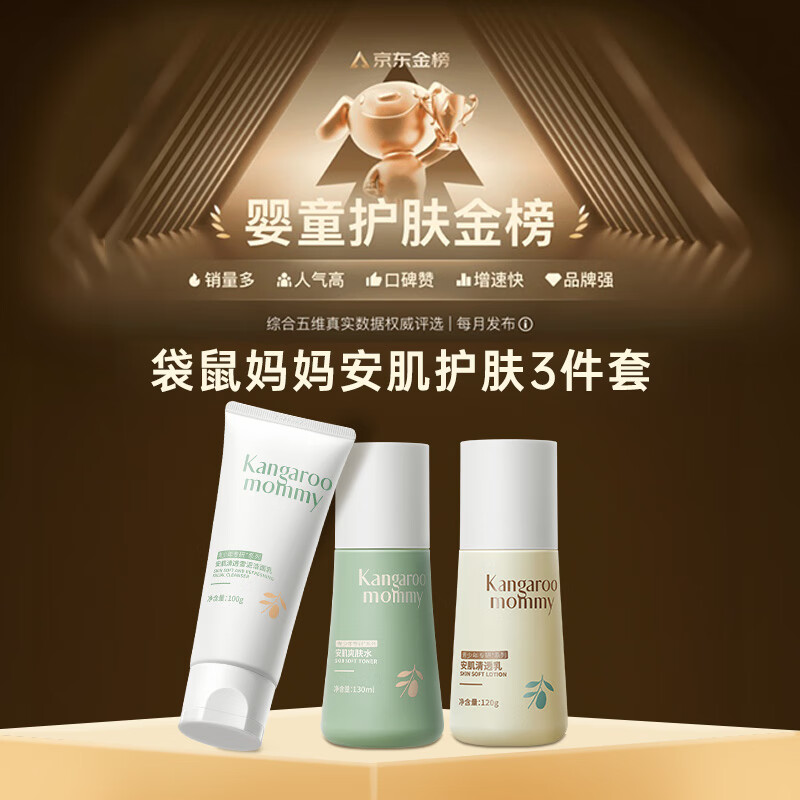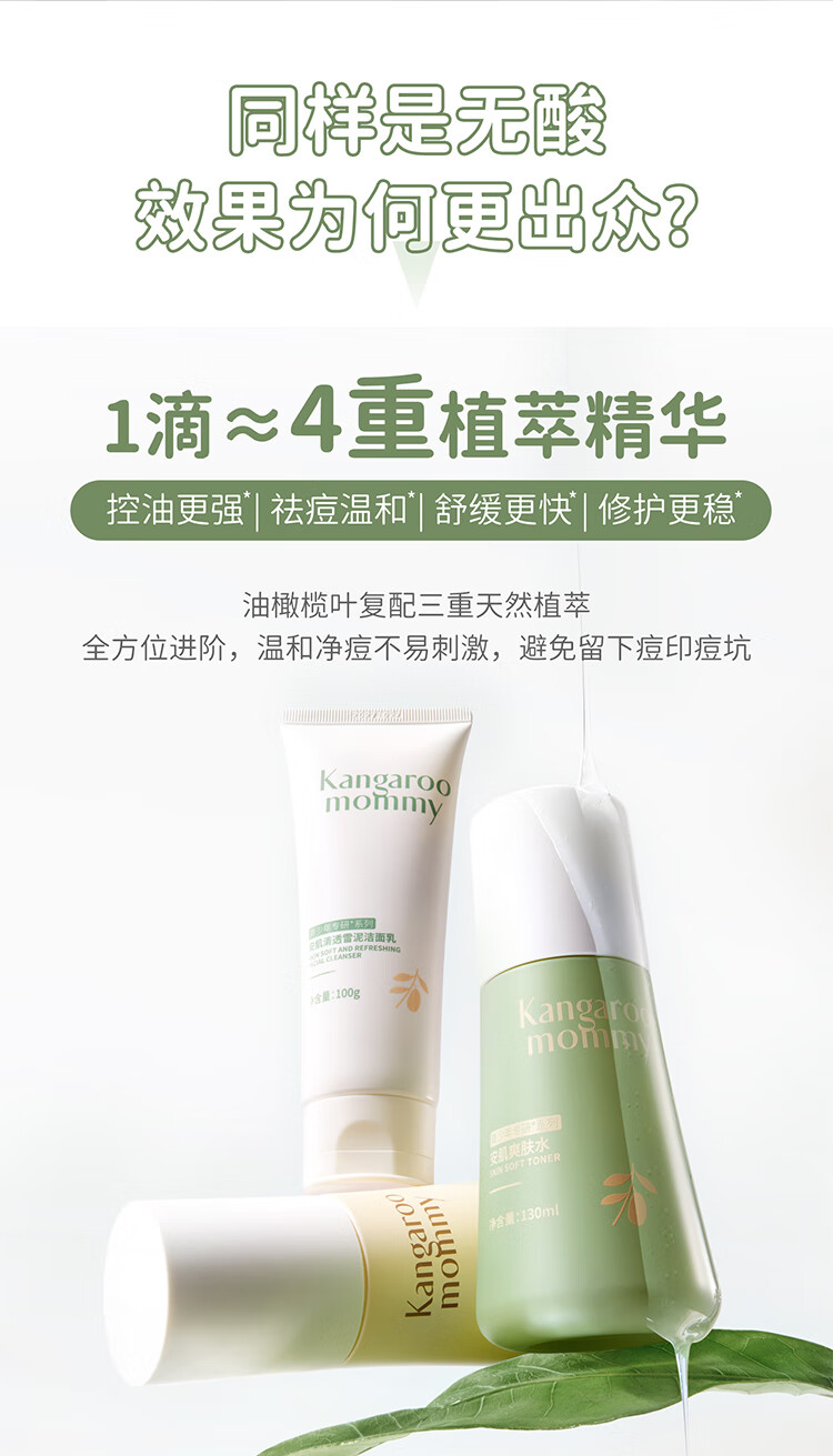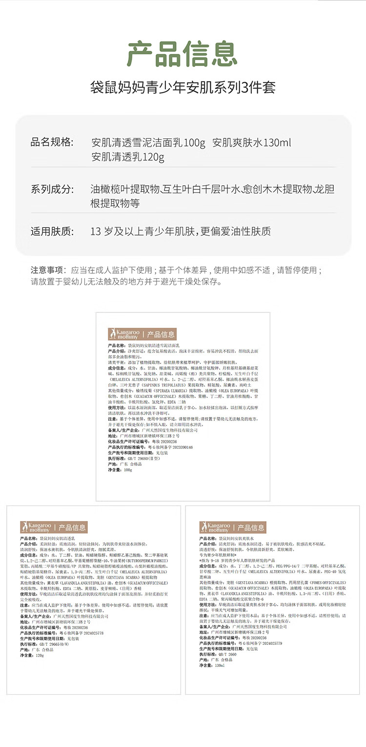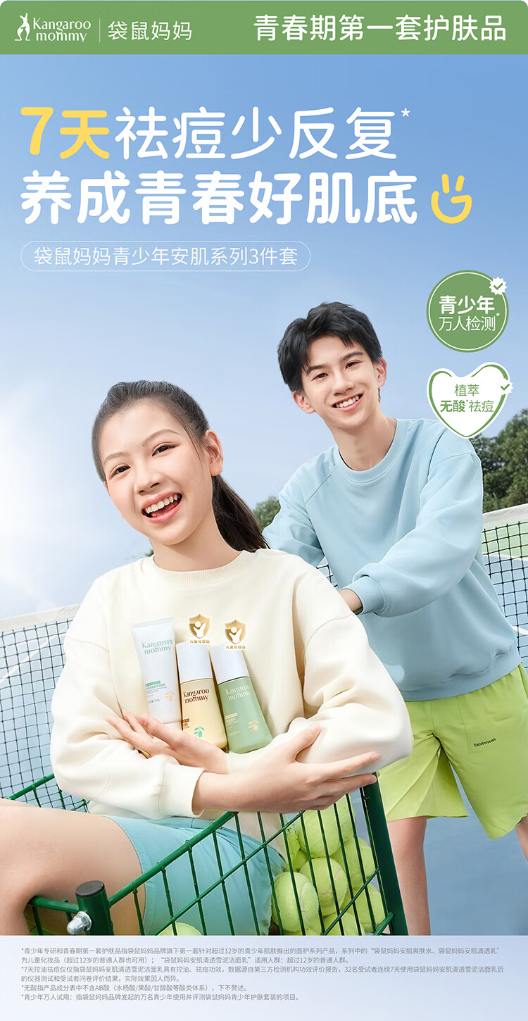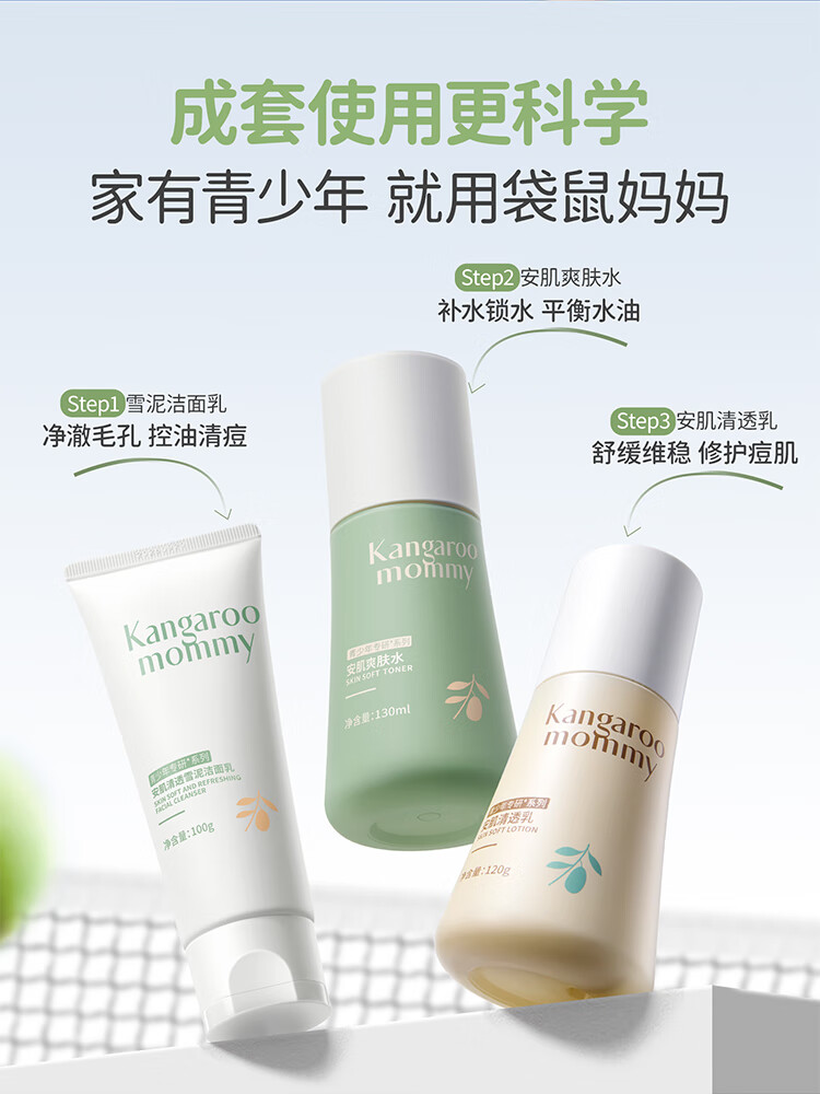 袋鼠妈妈青少年护肤套装 控油祛痘洁水乳三件套12-18岁男女孩青春期学生