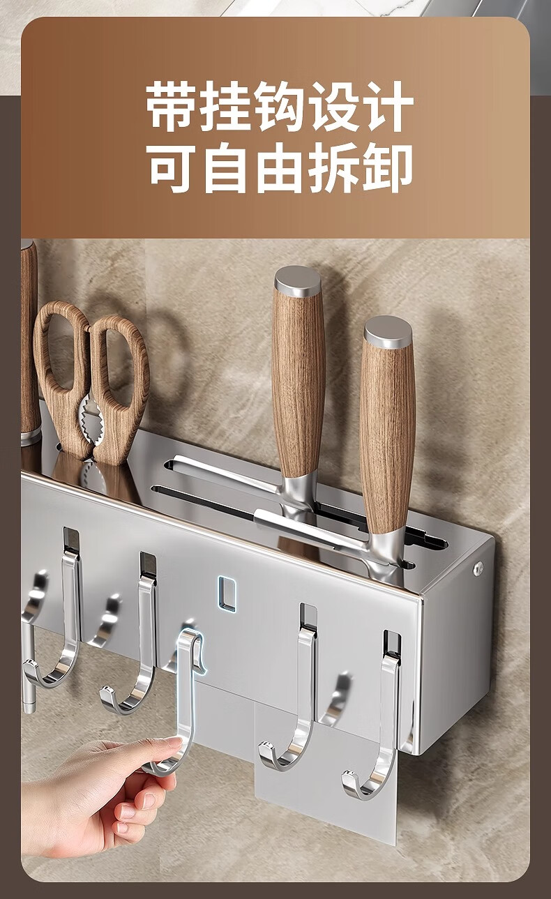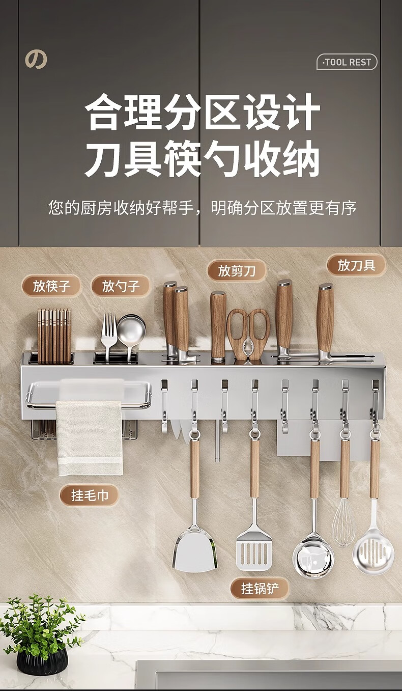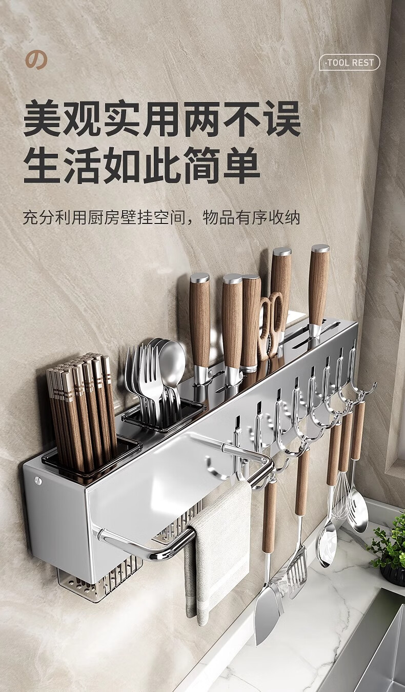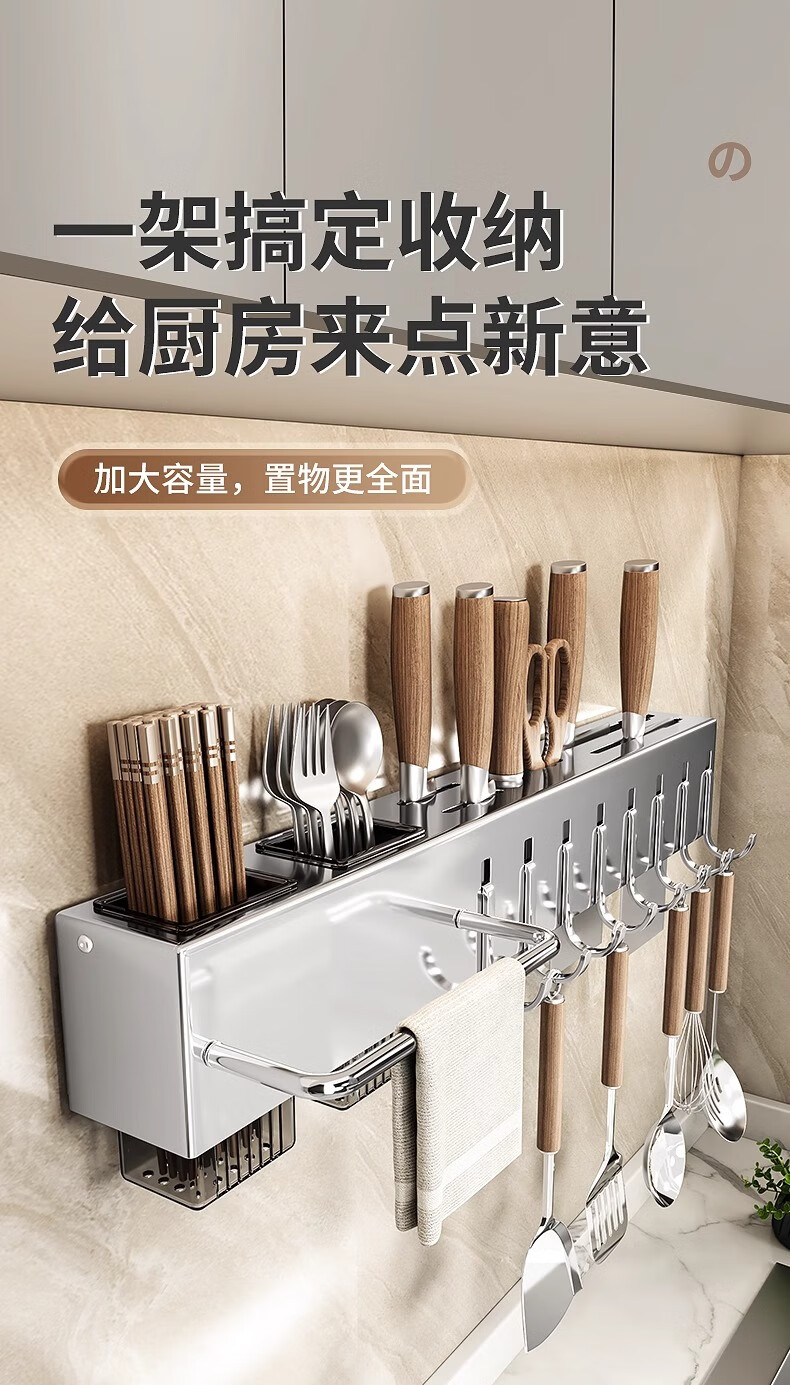 简漾枪灰吸盘刀架厨房置物架厨房多功能免打孔刀具筷子收纳架子 枪灰.【吸盘款】30cm刀架+单筷筒
