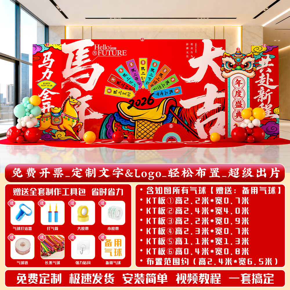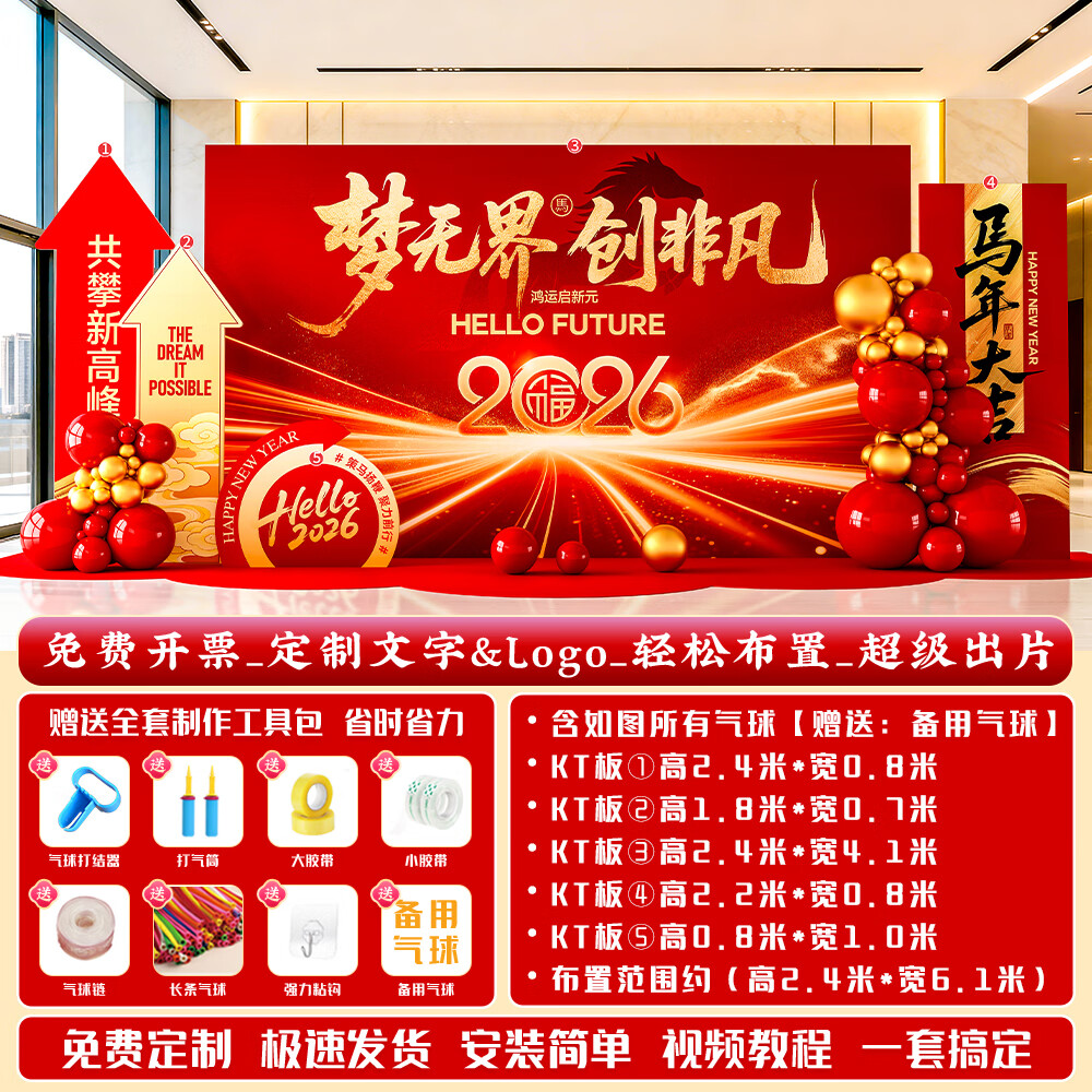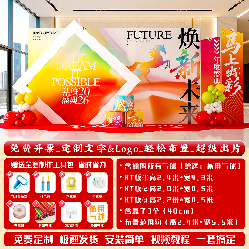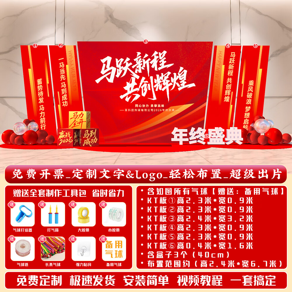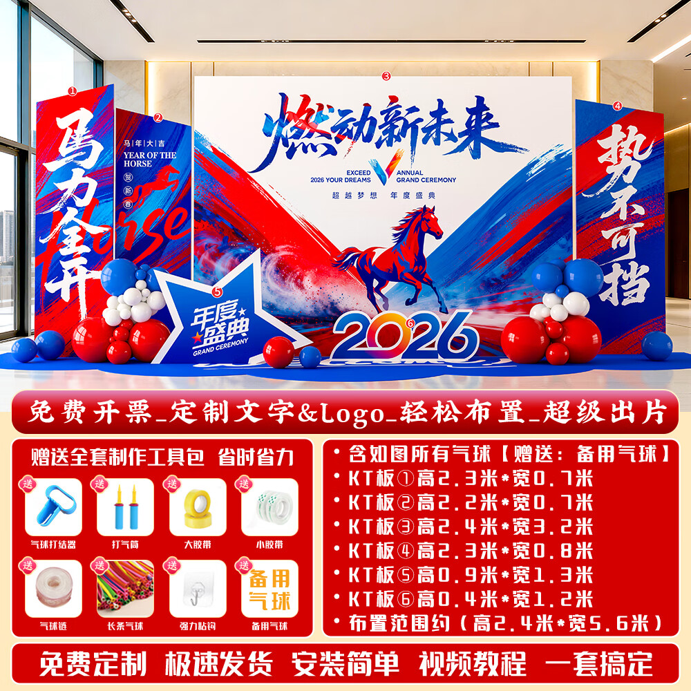 玺飞年会现场布置2026马年场景氛围感装饰新年公司会场签到背景墙kt板 次日达/80款年会背景墙【高2.0*宽4.8】