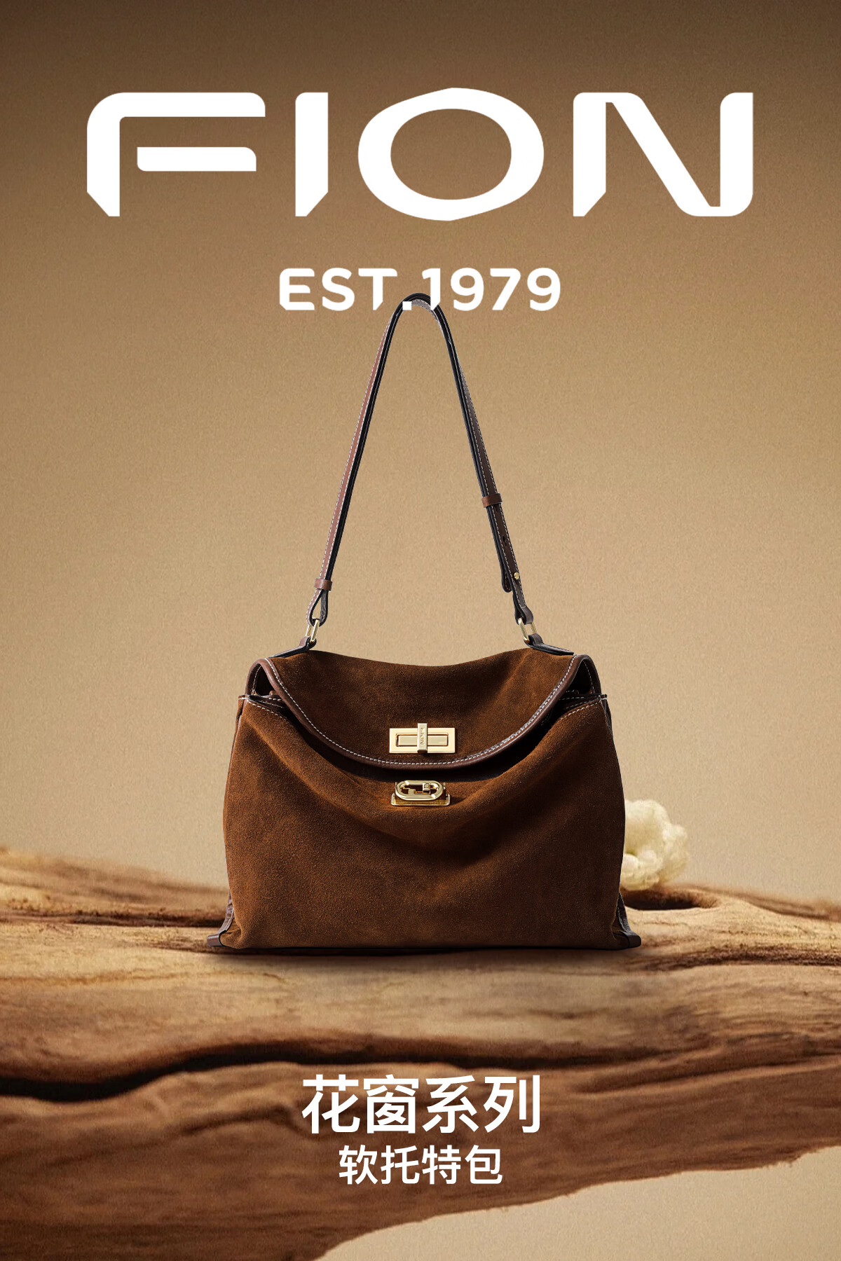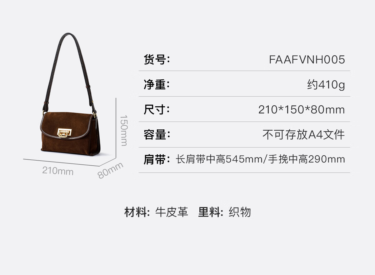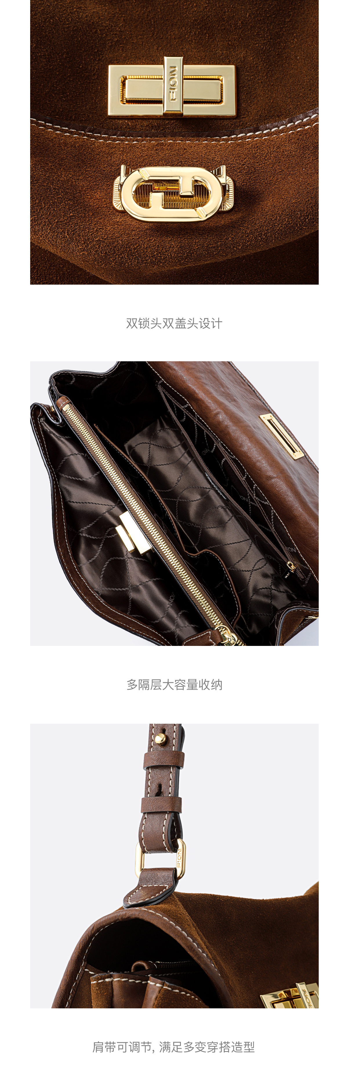 菲安妮(FION)2025新款女包双锁扣高级感托特包单肩包斜挎包圣诞礼物 反绒牛皮复古棕-中款